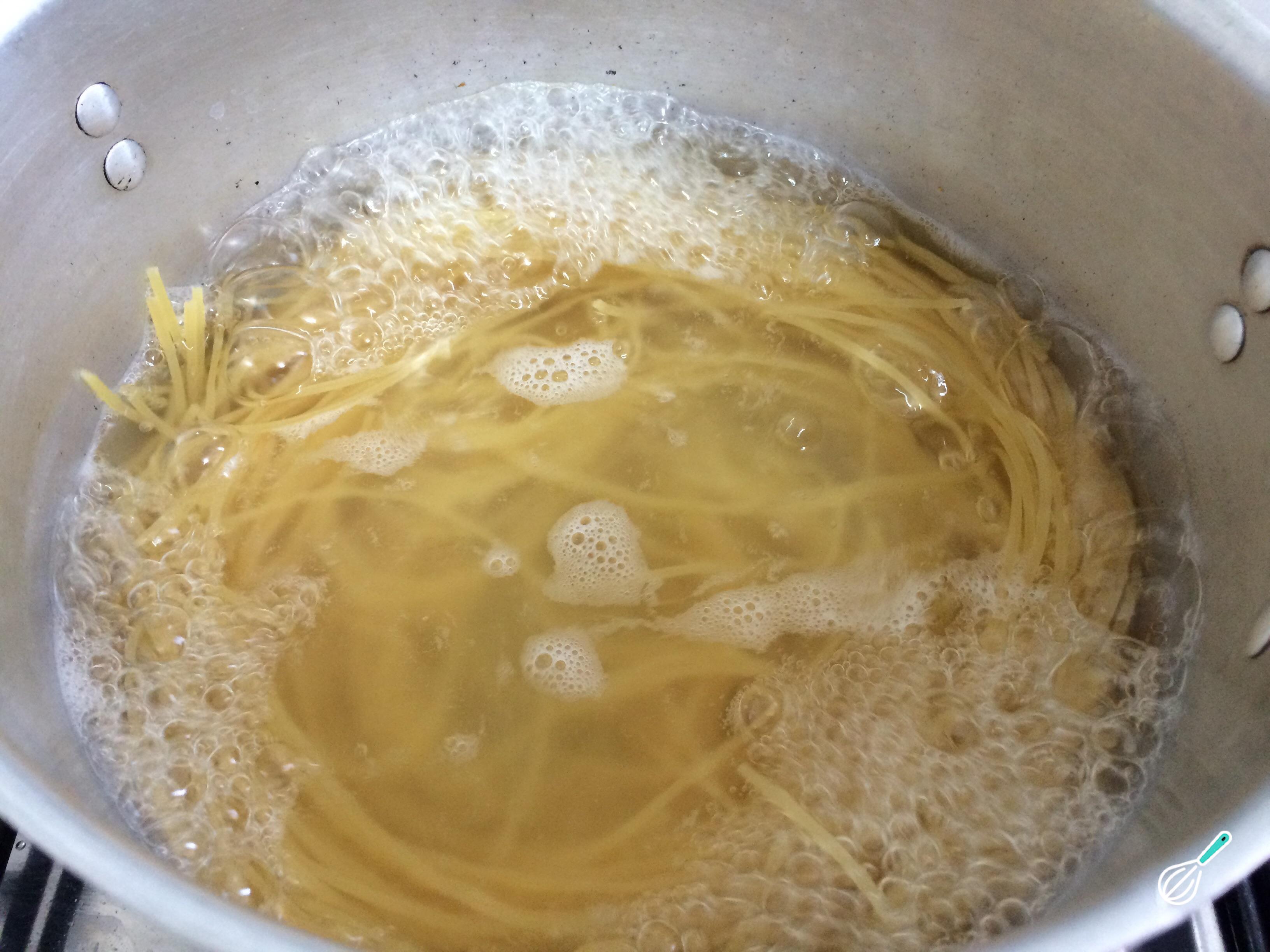 Enquanto isso, cozinhe o macarrão do jeito tradicional: numa panela com água fervente e um pouco de sal, até que esteja ao se gosto.