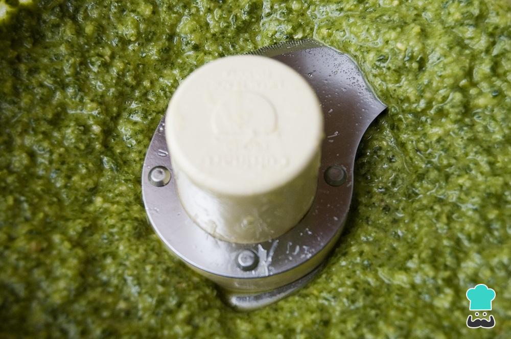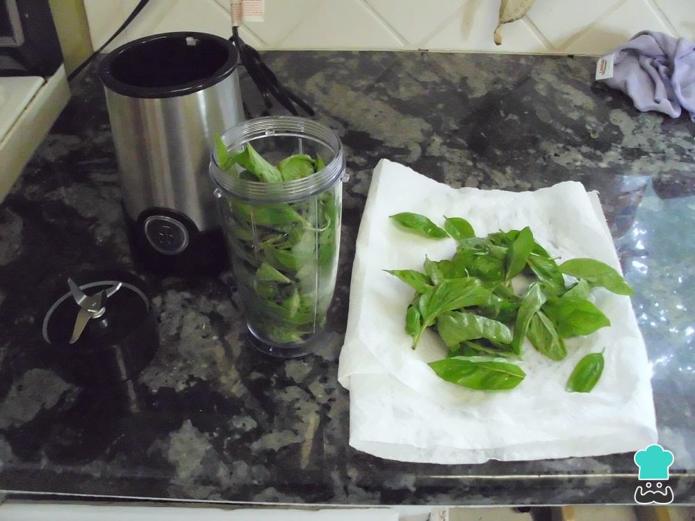 Coloque todos os ingredientes do pesto no liquidificador ou em um processador de cozinha e bata por 5 minutos, até virar uma pasta consistente.