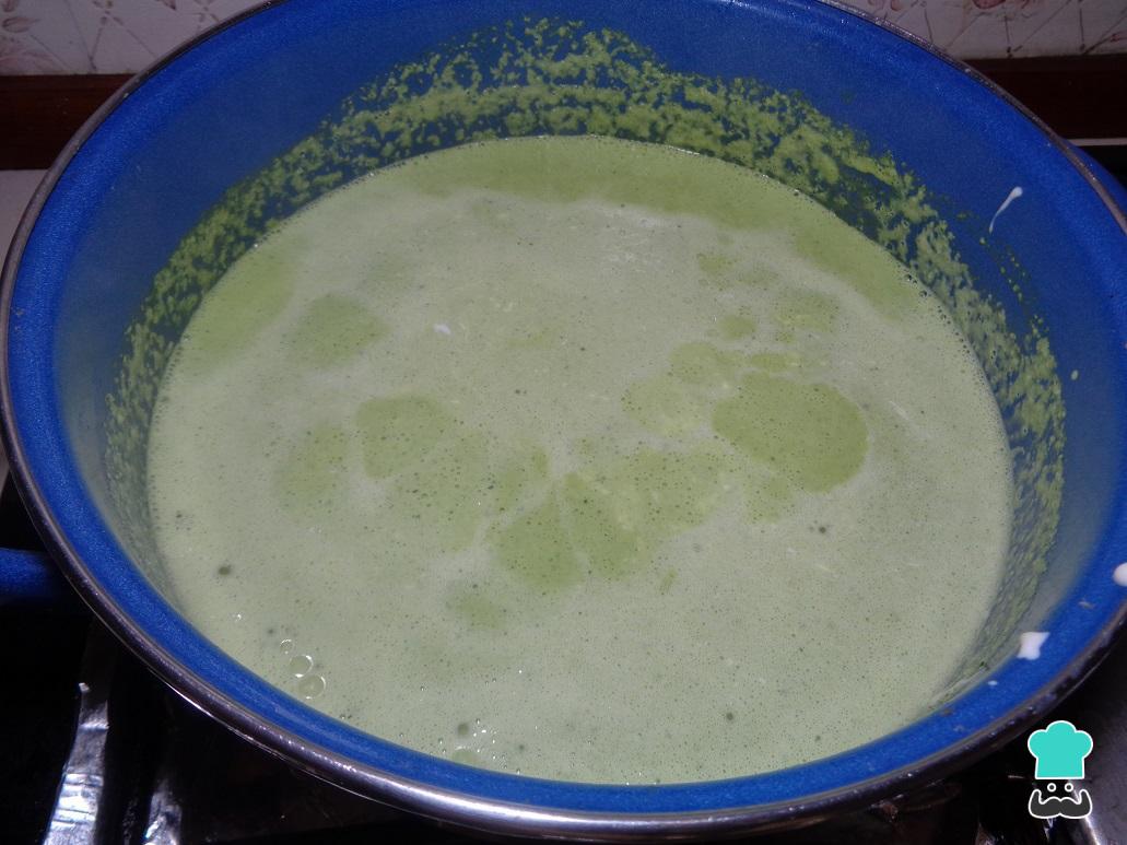 Em seguida coloque em uma panela o molho que batemos no liquidificador e leve ao fogo médio. Mexa bem e deixe o molho do macarrão verde ferver por alguns minutos.