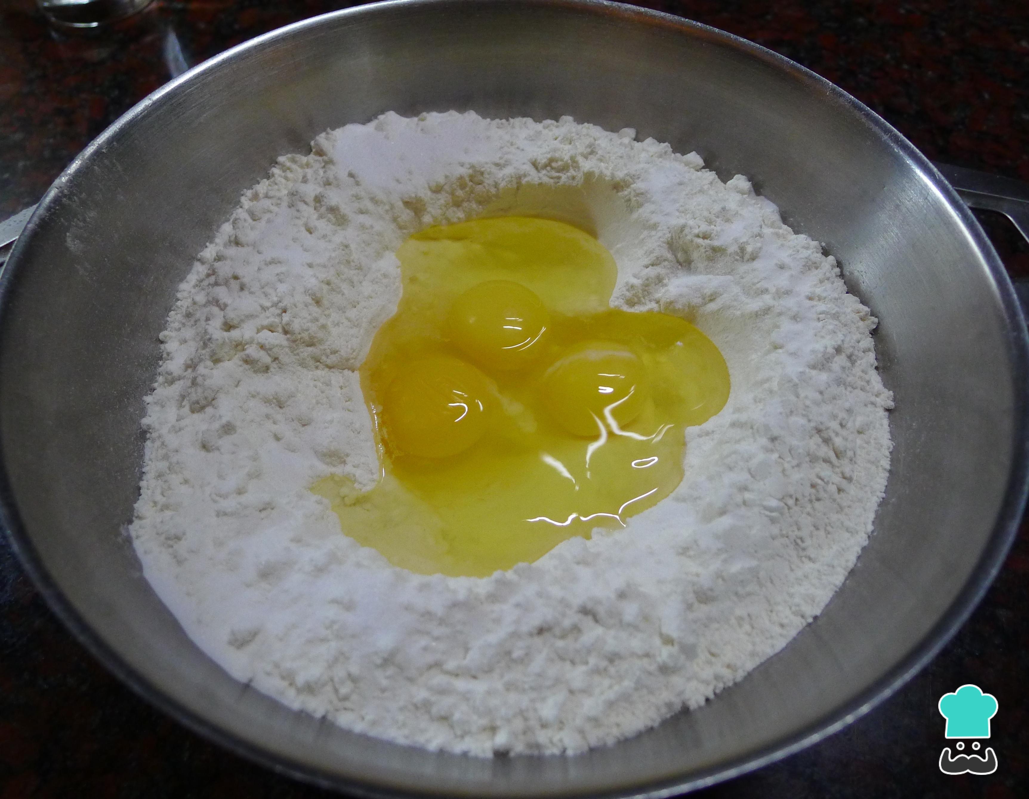 Em seguida coloque 500 gramas de farinha em uma vasilha, abra um buraco ao centro e coloque aí o sal e os 3 ovos, como na imagem.