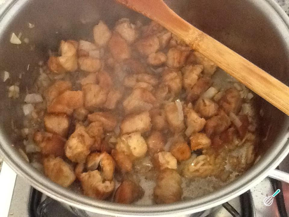 Para preparar esse macarrão chinês com frango, comece por fazer o molho. Coloque em uma panela o alho picado com um fio de óleo ou azeite de oliva. Refogue o frango em pedaços, misturando sempre. Assim que estiver selado, junte um fio de vinho branco e o cubo de caldo de frango.