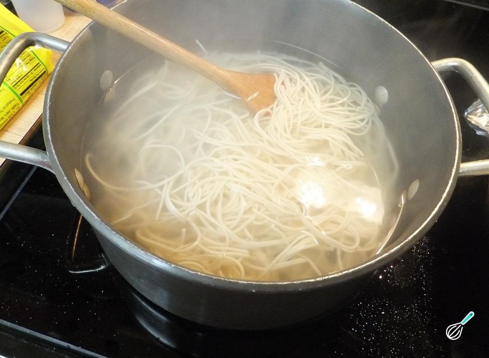 Para cozinhar o macarrão, coloque a água abundante para ferver em uma panela. Quando ferver, adicione o sal e uma colher de sopa de azeite de oliva, juntamente com o macarrão. Cozinhar de acordo com as instruções da embalagem. Retire a massa e escorra.