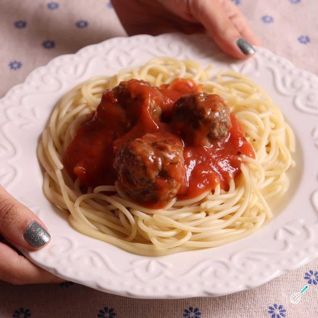 Sirva em seguida o macarrão espaguete com o molho e as almôndegas. Bom apetite!