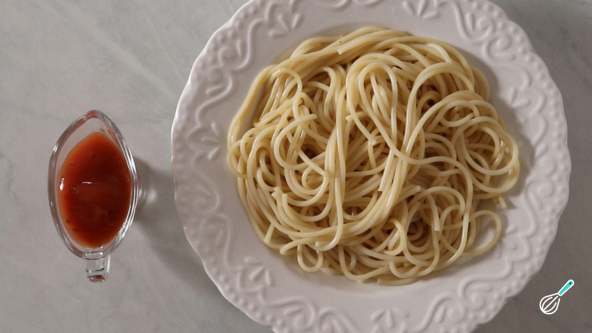 Comece cozinhando o macarrão de acordo com as instruções da embalagem e separe o molho de tomate. Aqui, nós escolhemos o espaguete, mas você pode usar outros tipos de macarrão como o penne, o talharim ou o fusilli.