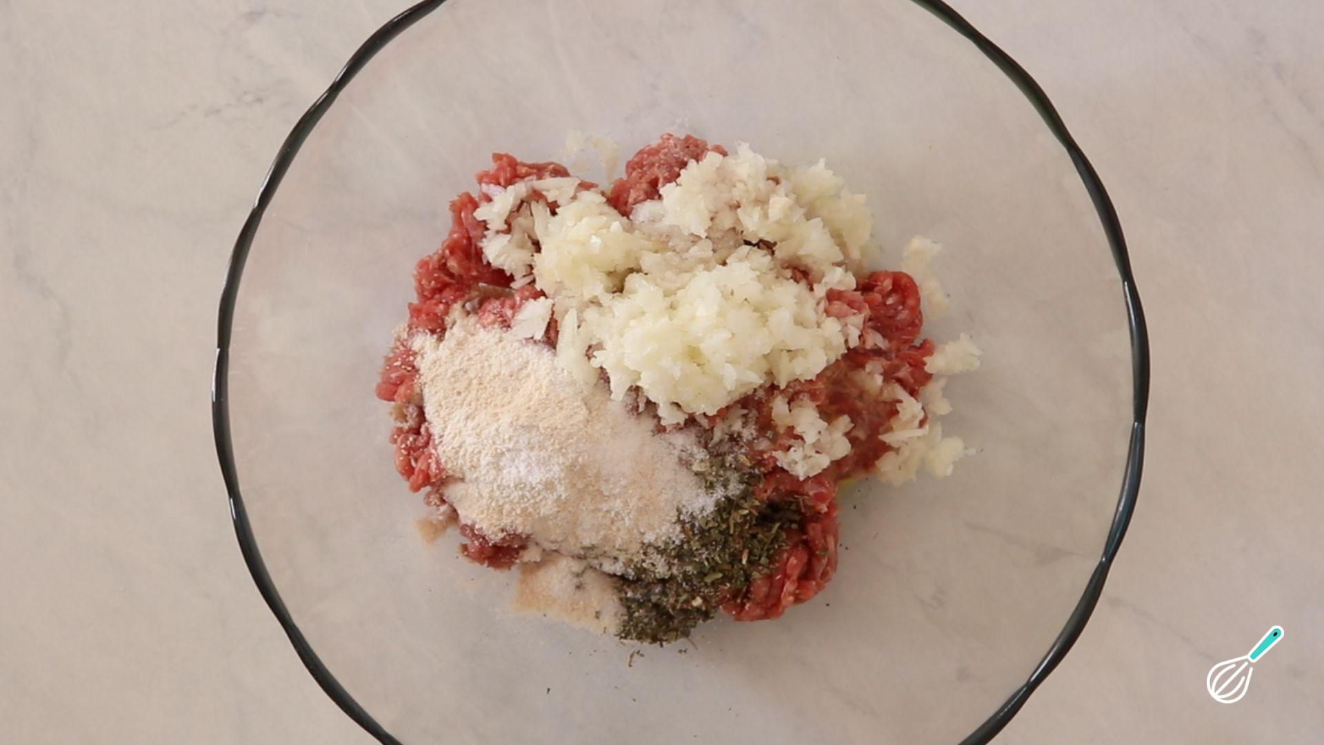 Em seguida vamos preparar as almôndegas: em uma tigela grande coloque todos os ingredientes exceto o azeite e o molho de tomate.