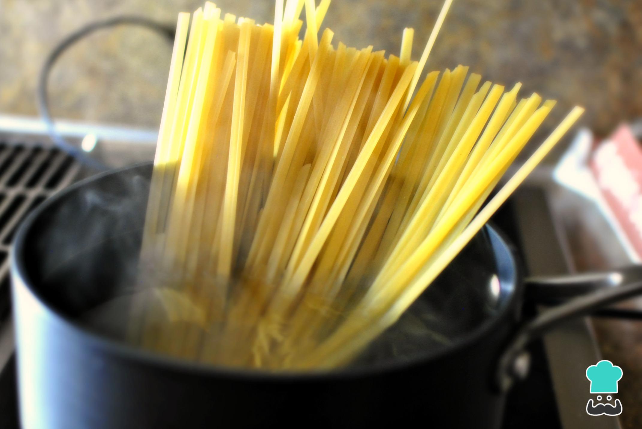 Enquanto a cebola refoga, aproveite para preparar o resto dos ingredientes. Escorra o atum e corte-o em pedaços pequenos, assim como a cebola e o alho. Assim que a água ferver, adicione a pasta e uma folha de louro. Deixe cozinhar até ficar al dente.