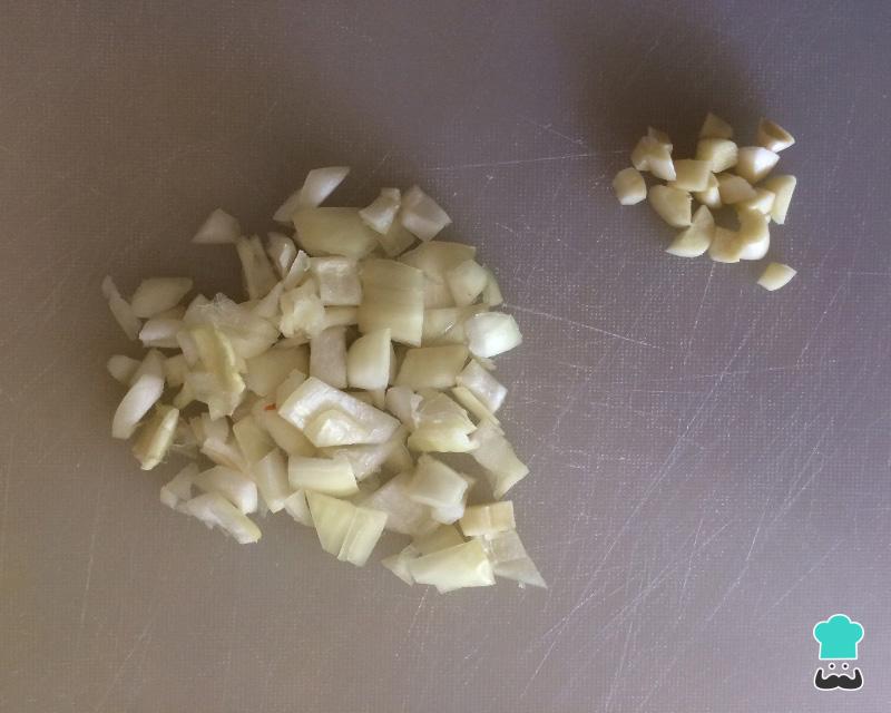 Enquanto o macarrão cozinha, pique a cebola e o alho em pedacinhos.