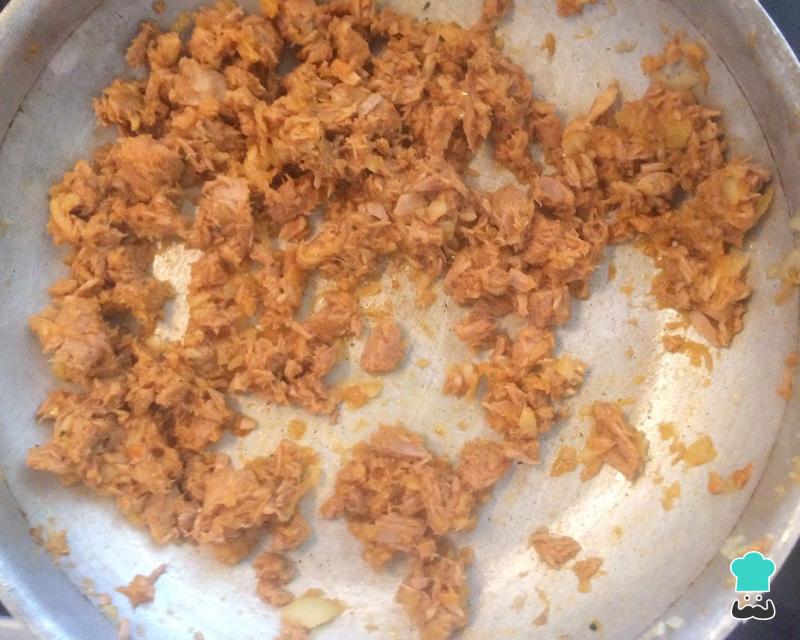 Continue preparando esta receita de macarrão com atum em lata: coloque o atum, o alho, a cebola, um pouco de azeite e molho de tomate a gosto em uma frigideira e deixe apurar. Depois junte a cebolinha e a salsinha, para conferir mais sabor, misture e desligue o fogo.