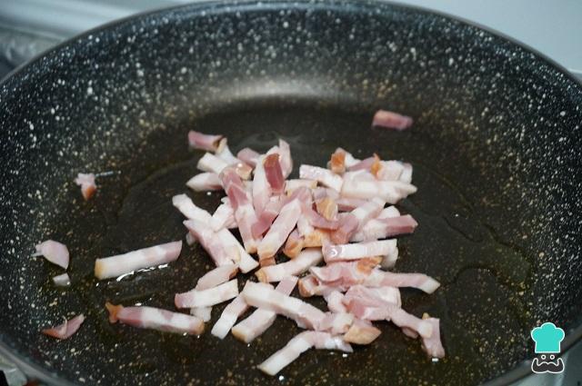 Leve também ao fogo uma frigideira com um pouco de óleo e frite o bacon até começar a dourar.