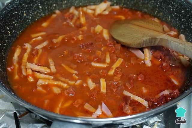 Junte a calabresa, deixe dourar um pouco também e adicione o molho de tomate. Misture tudo e deixe ferver até espessar um pouco.