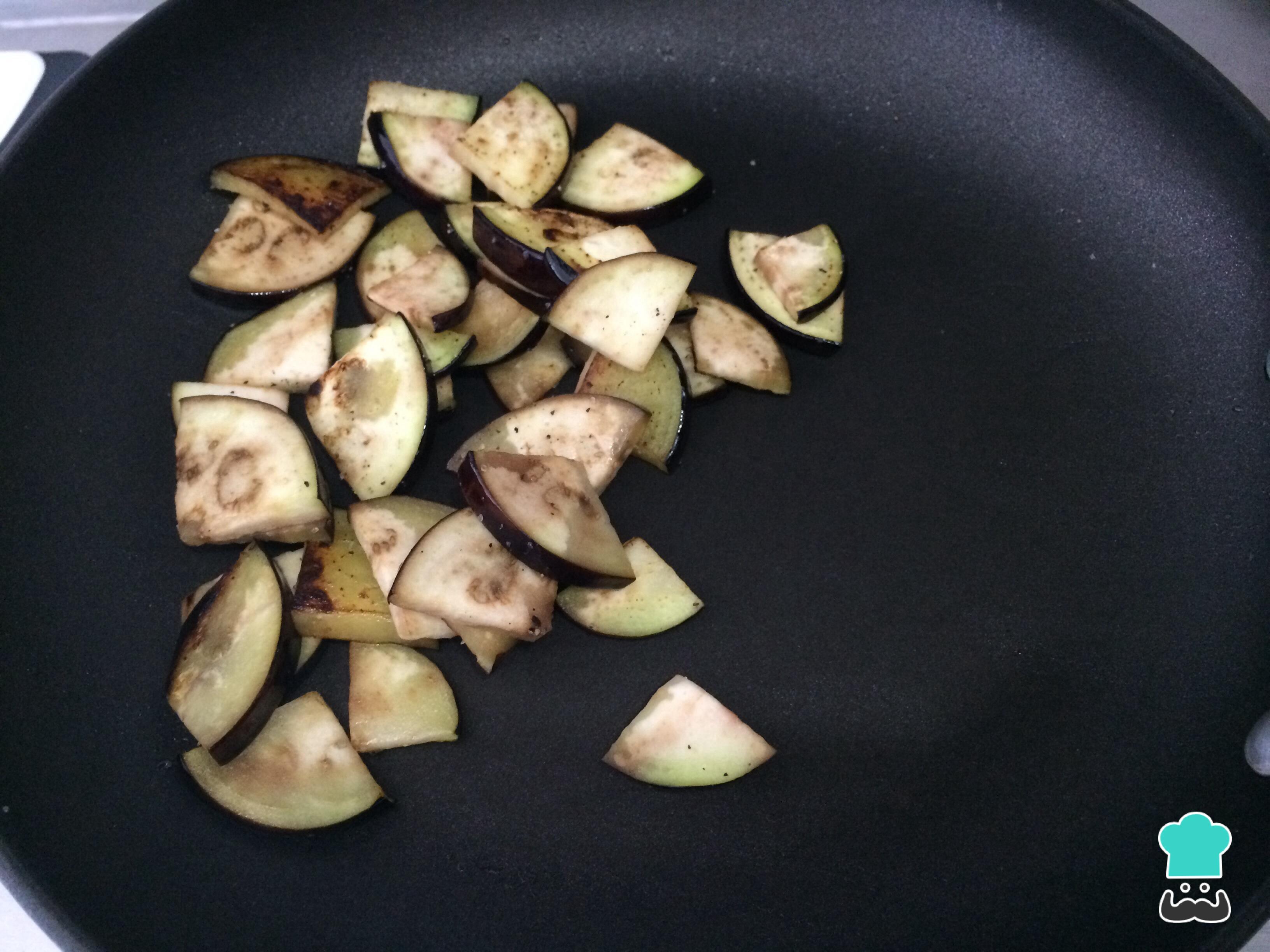 Corte a berinjelaem triângulos pequenos e cozinhe-a em uma frigideira com o óleo até ficar dourada, tempere com sal e pimenta. Assim que estiver pronta reserve.