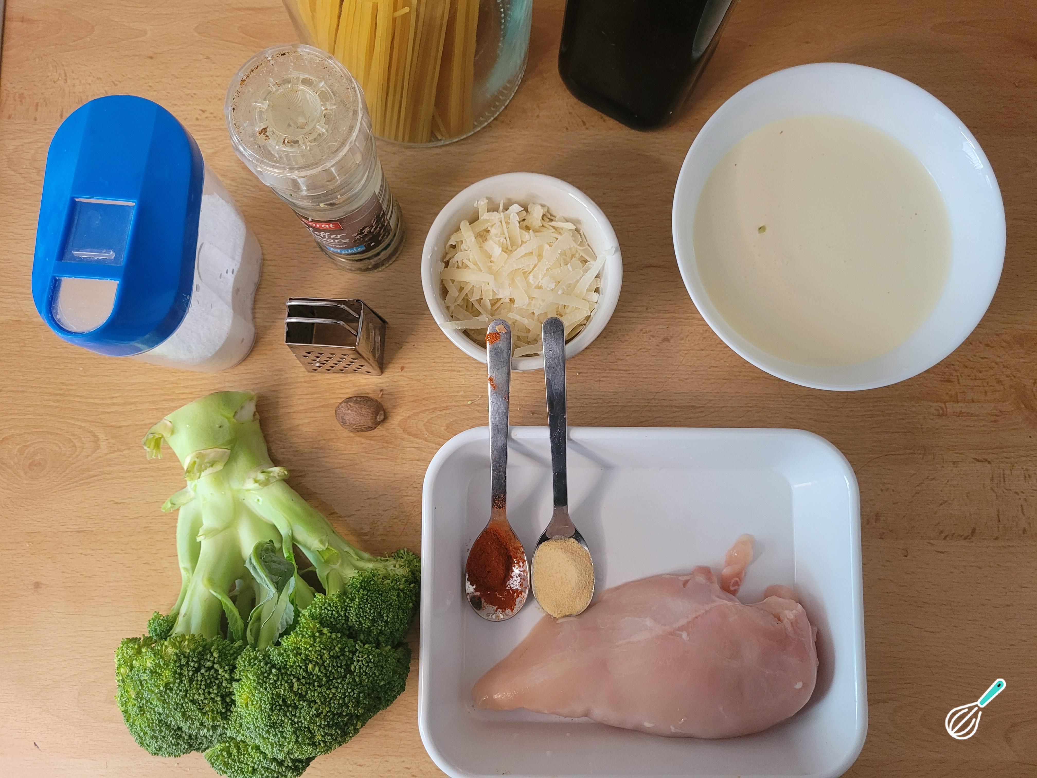 Comece separando todos os ingredientes para preparar seu macarrão com brócolis e creme de leite.