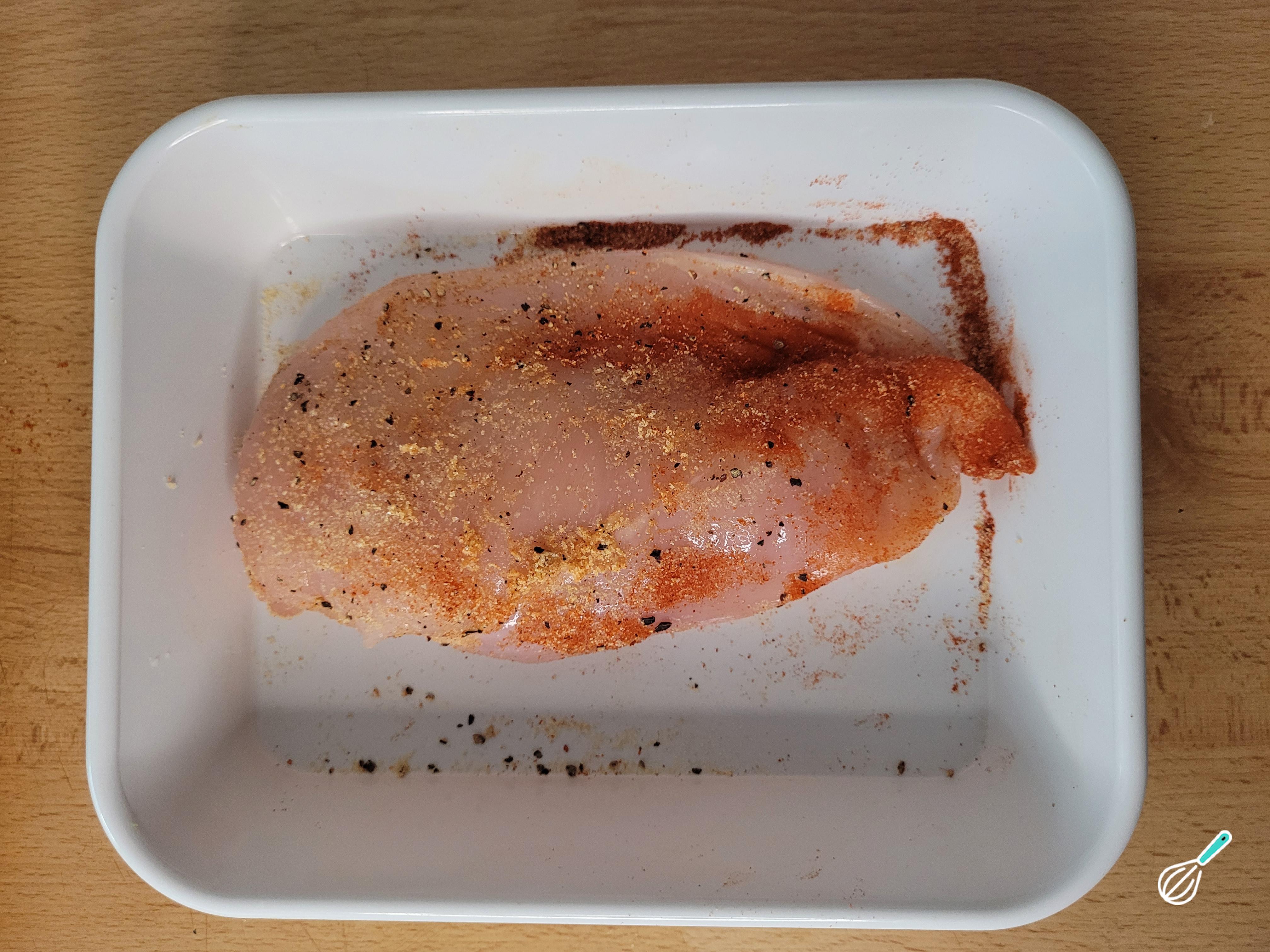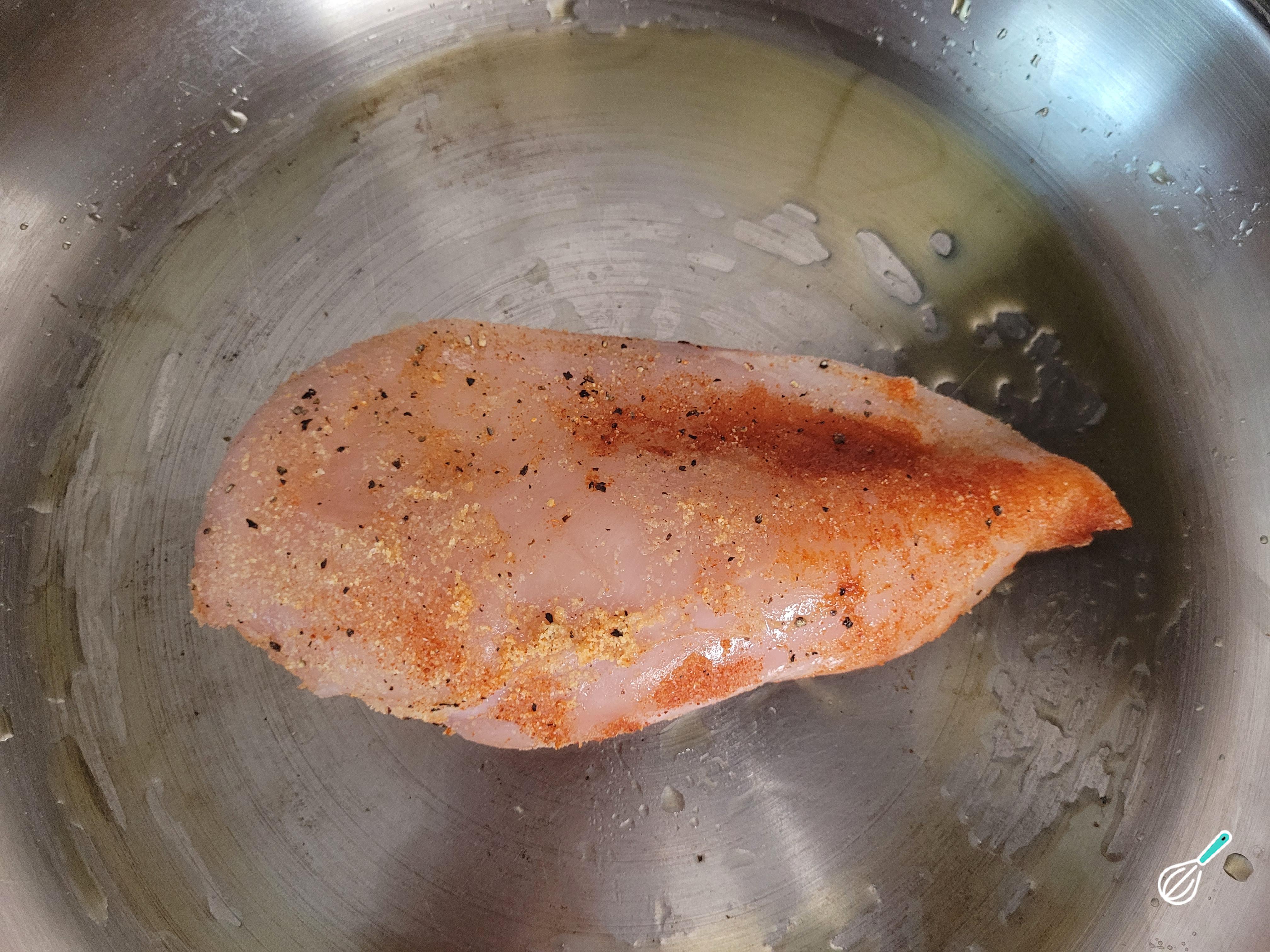 Comece colocando água para ferver em uma panela grande para cozinhar o macarrão. Enquanto isso, tempere bem o frango como preferir. Eu uso sal, pimenta do reino, alho em pó e páprica.