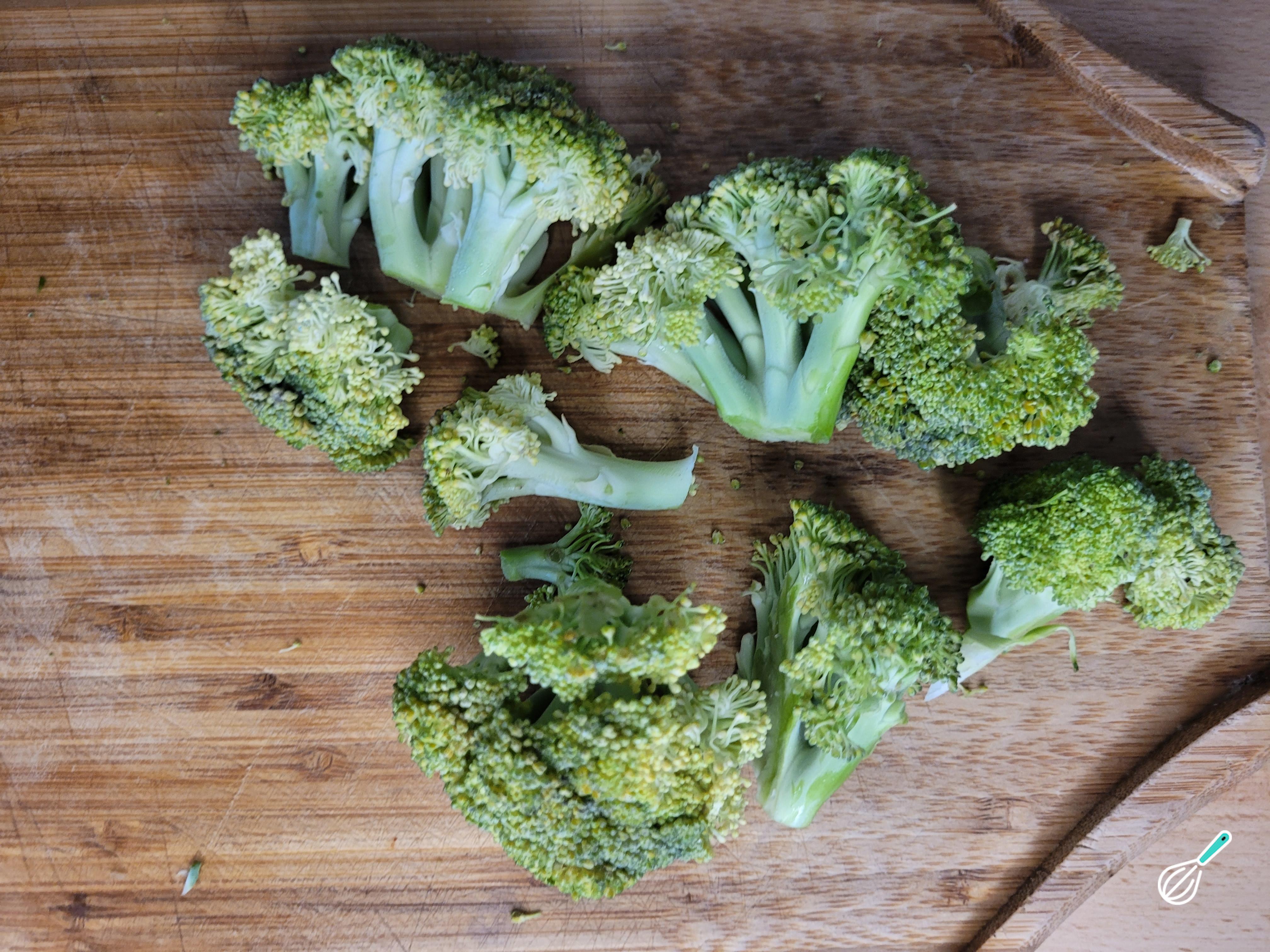 Enquanto isso, corte os brócolis em floretes, descartando o talo.