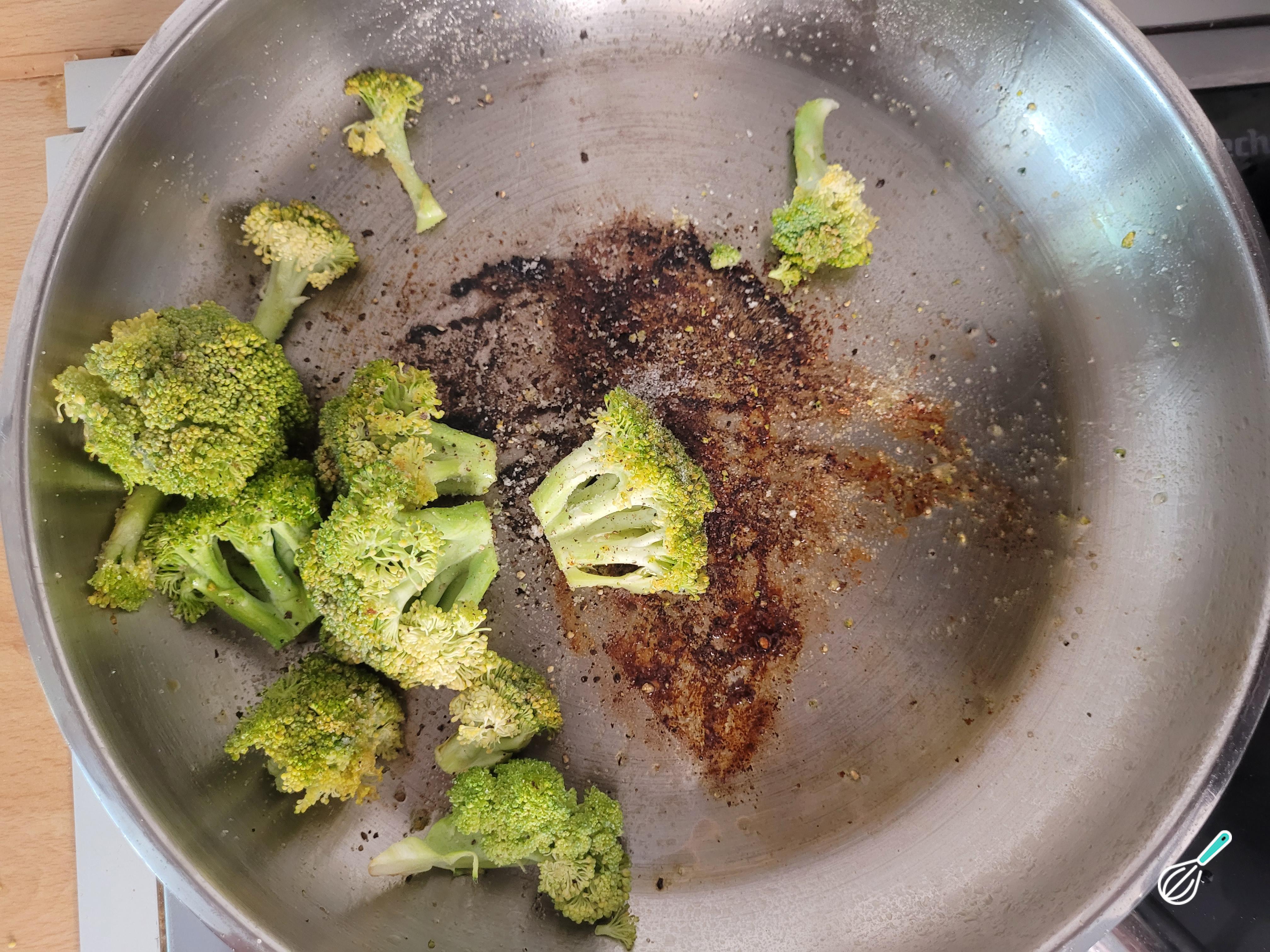 Quando o frango estiver cozido, reserve e na mesma frigideira adicione o brócolis para refogar. Tempere com sal e pimenta do reino. Comece deixando dourar um pouco. Depois tampe a frigideira para que eles cozinhem mais rápido e fiquem macios.