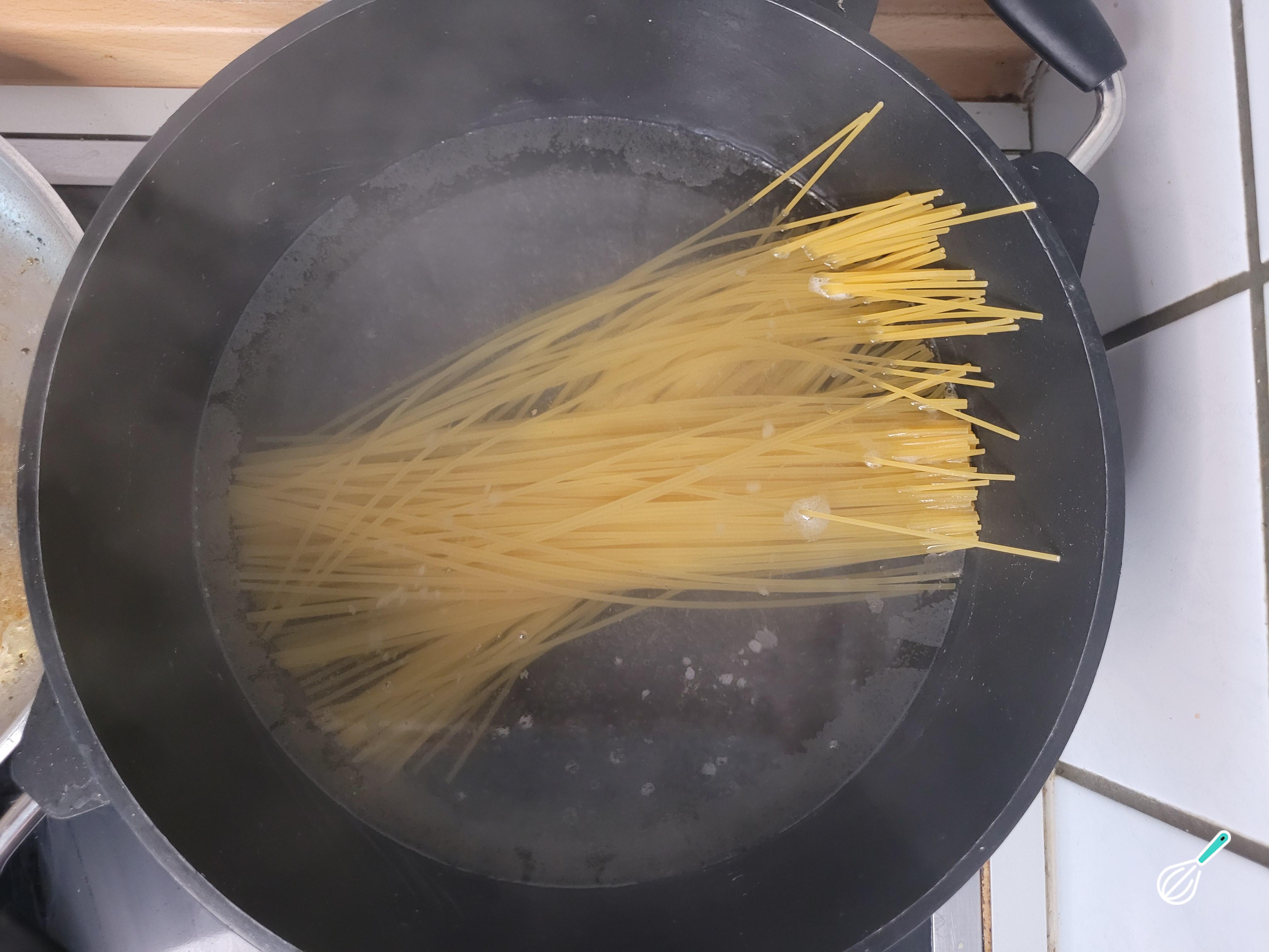Neste ponto, verifique se a água já está fervendo. Adicione sal e coloque o macarrão para cozinhar pelo tempo indicado na embalagem da massa.