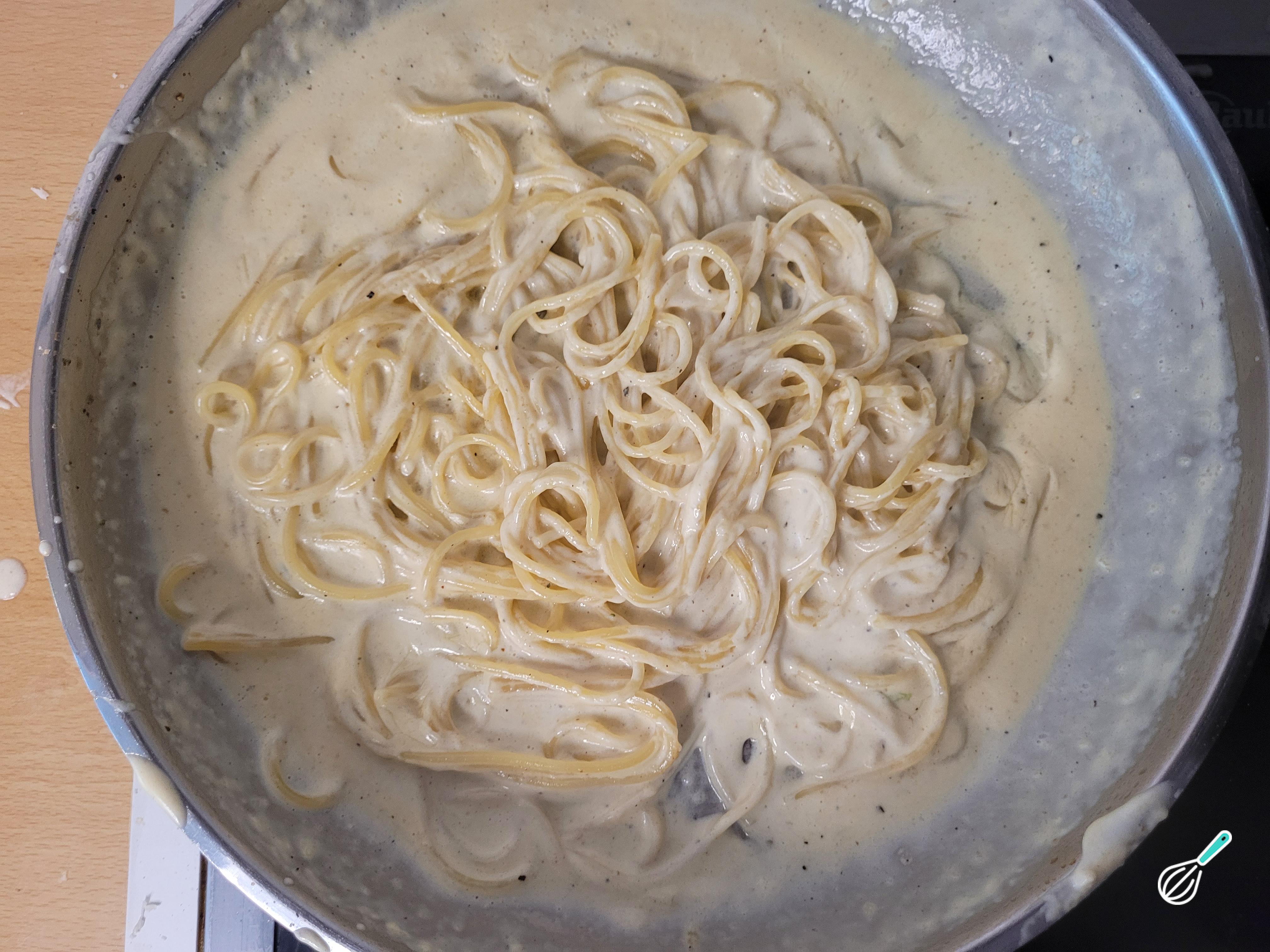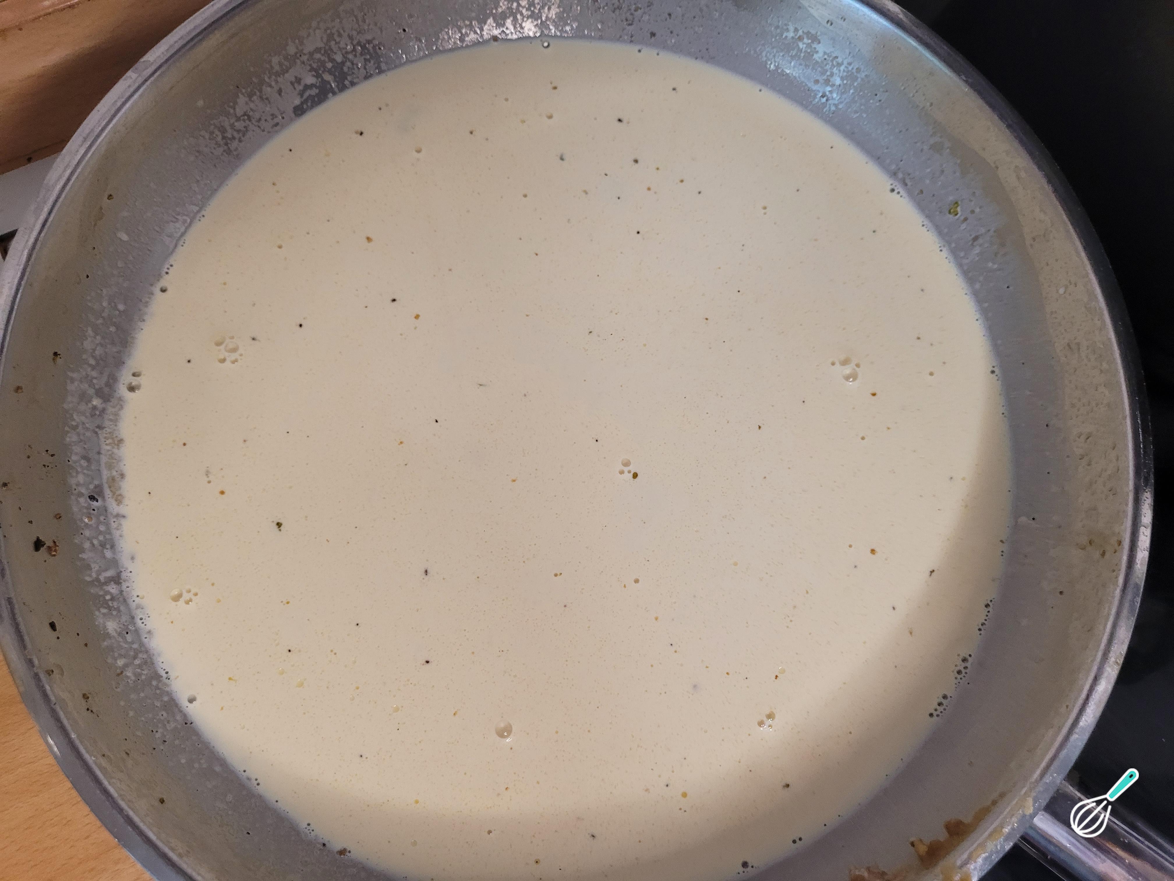 Mexa bem e deixe a farinha cozinhar por pelo menos 3 minutos para não ficar com gosto de farinha. Quando tiver mudado para uma cor levemente acastanhada, adicione o creme de leite sempre batendo bem com um batedor de arame para não empelotar. Tempere com pimenta do reino, noz moscada, adicione o parmesão e deixe o molho reduzir e engrossar um pouco, mexendo para não grudar.