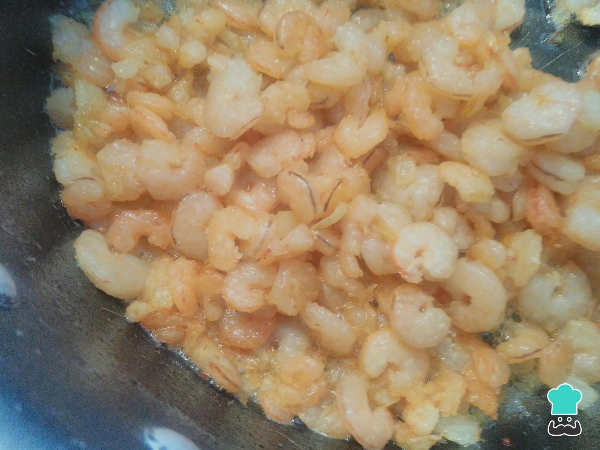 Enquanto isso lave os camarões e tire as veias se desejar. Coloque a manteiga numa panela com a cebola picada e em fogo médio deixe que fique translúcida. Adicione os camarões, polvilhe sal e deixe fritar por 5 minutos ou até mudarem de cor.
