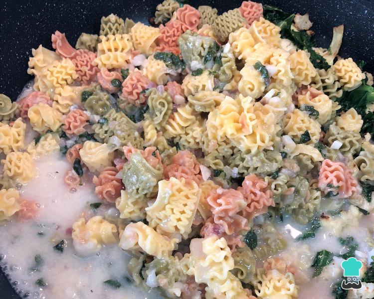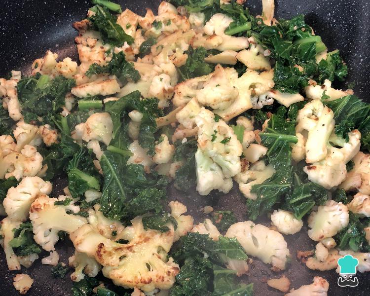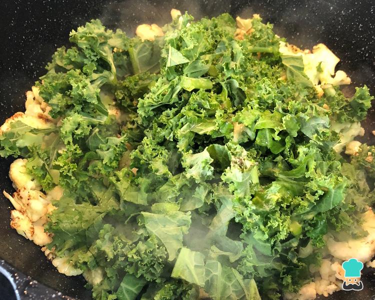 O passo seguinte desta receita de macarrão com couve flor e molho branco é juntar a couve kale fatiada e refogar por mais alguns minutos.