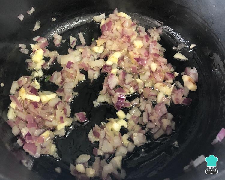Para começar preparando o molho branco em outra panela refogue a cebola e depois o alho no azeite restante.