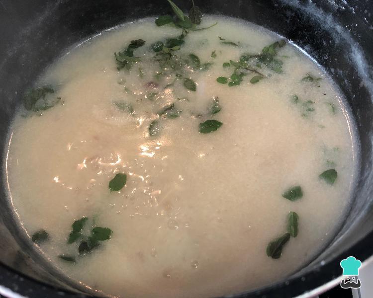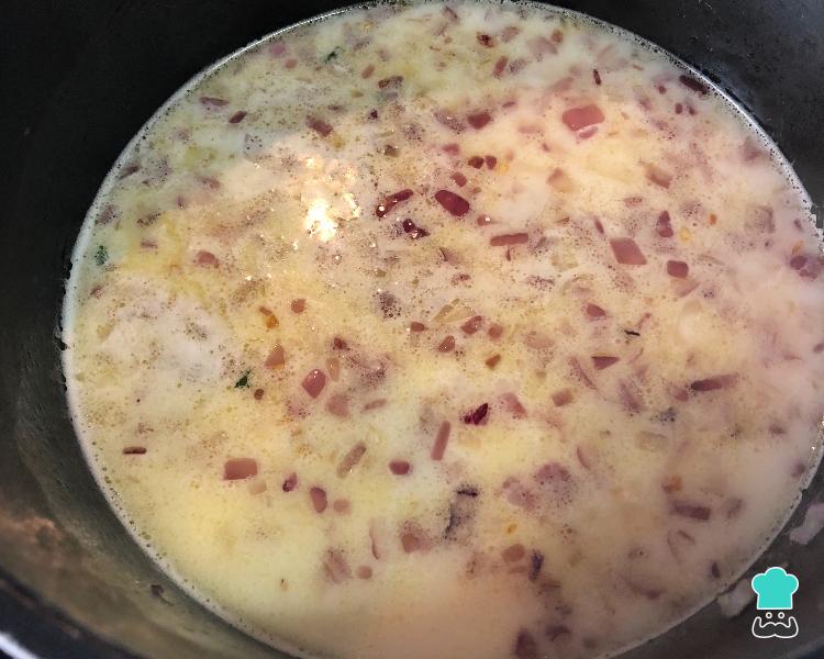 Coloque essa mistura de amido e leite no refogado de cebola e alho mexa até virar um creme (a textura pretendida é de um mingau mole).