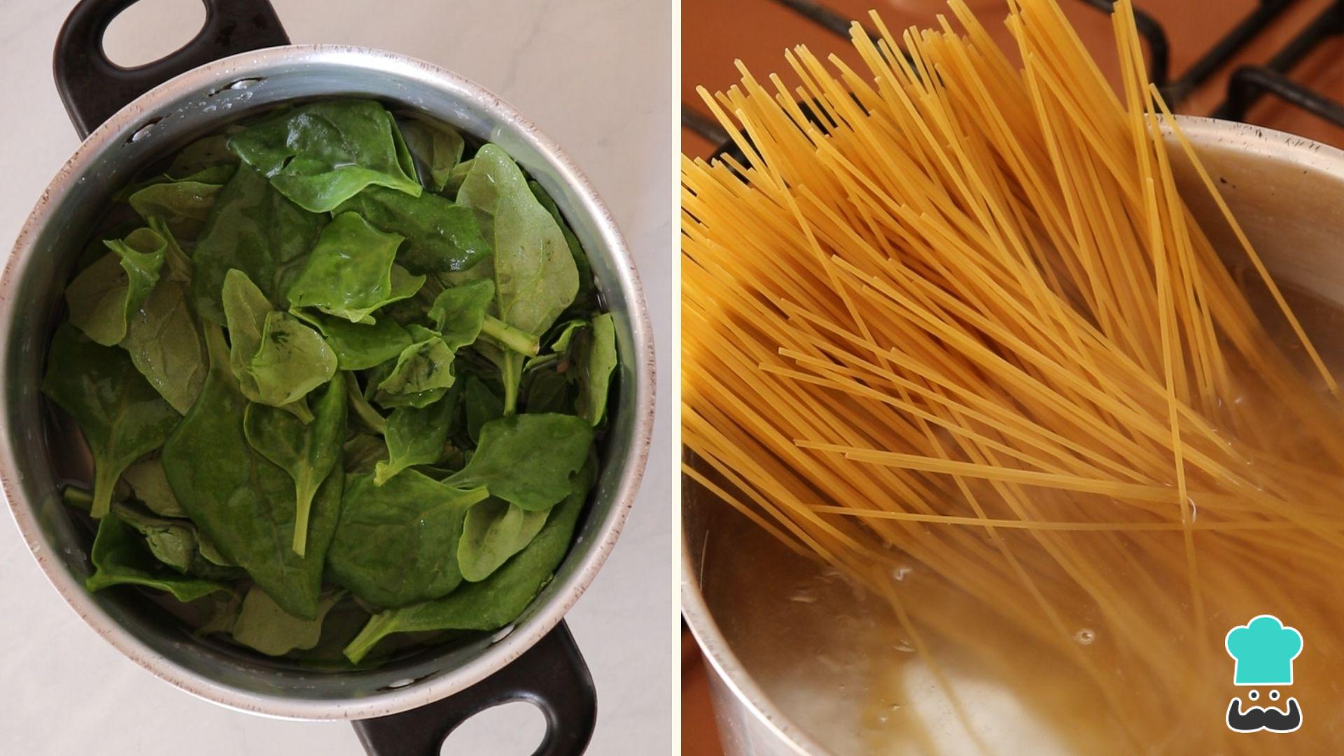 Comece cozinhando o macarrão de acordo com as instruções da embalagem. Em seguida lave bem, retire do talo e cozinhe o espinafre em água com sal por 2 minutos. Escorra a água e reserve.