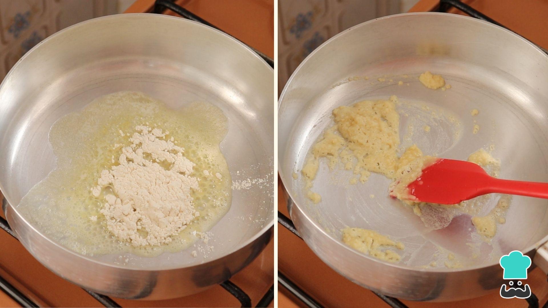 Agora vamos para o creme de espinafre para macarrão. A base do nosso creme de espinafre será um delicioso molho branco caseiro. Derreta a manteiga em fogo bem baixo e adicione a farinha de trigo. Mexa bem até que tudo se misture e fique levemente dourado (cuidado para não queimar!).