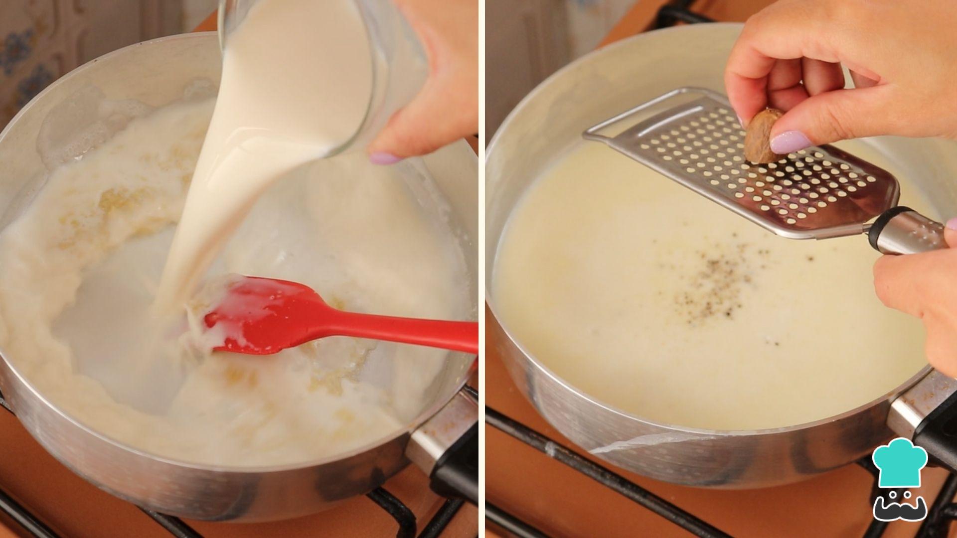 Acrescente o leite de uma só vez e misture bem para que não empelote. Quando estiver tudo bem dissolvido e incorporado, tempere com sal, pimenta e noz-moscada a gosto. Cozinhe até engrossar.