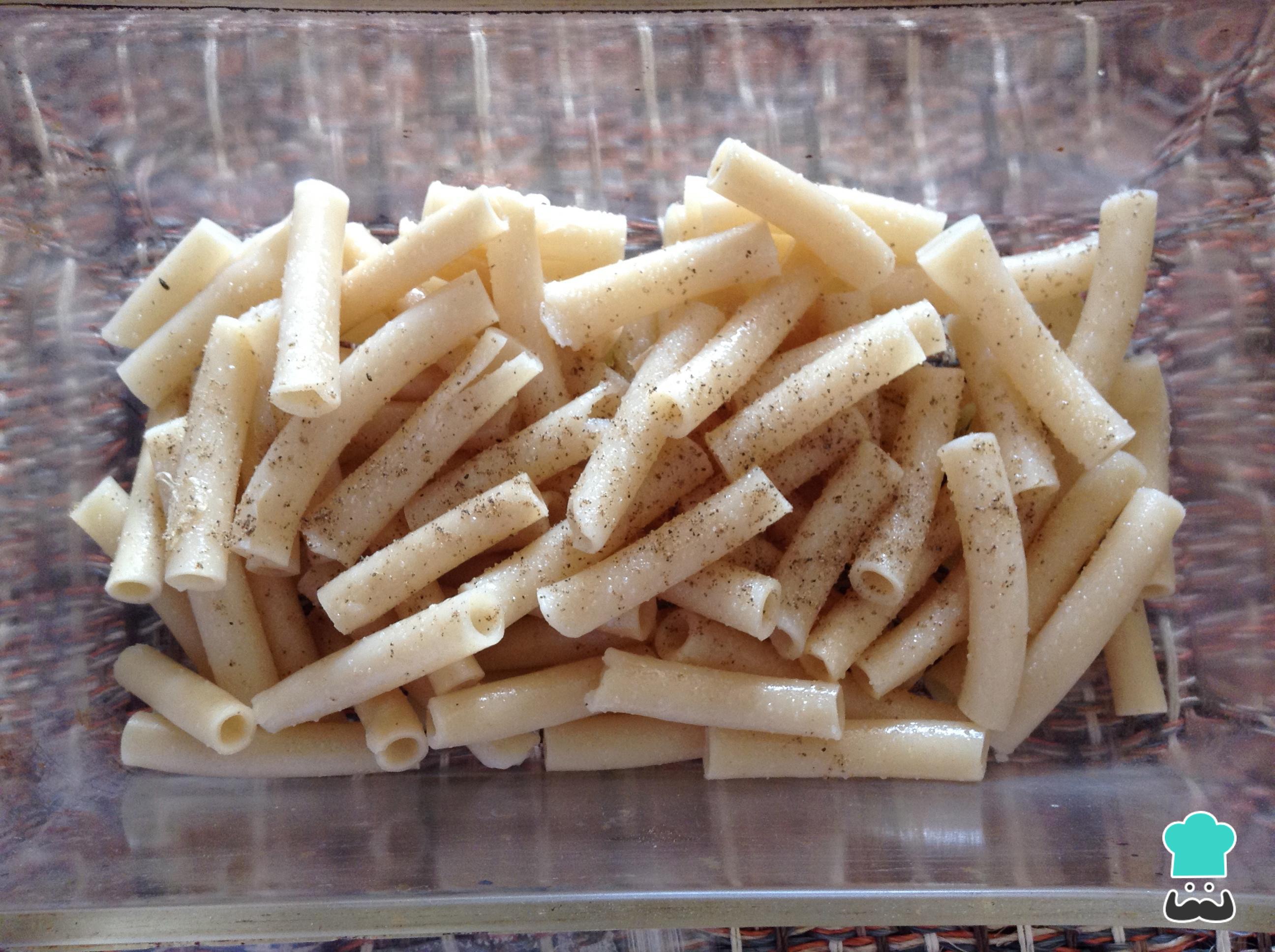 Em um refratário, previamente untado com azeite, coloque o macarrão já cozinhado e, se necessário, tempere com sal e pimenta. Reserve.