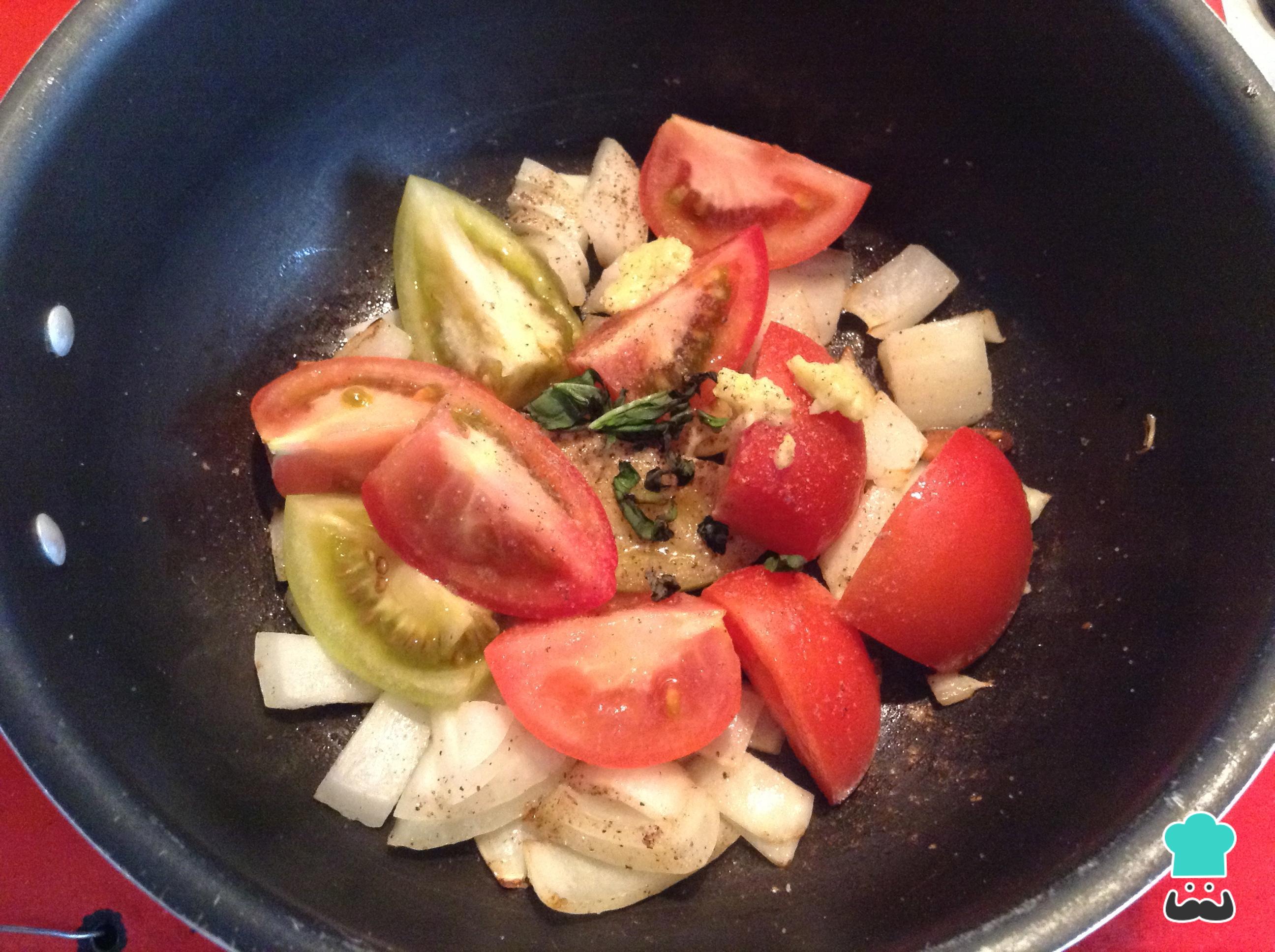 Numa panela em fogo médio com um pouco de azeite, refogue os tomates e as cebolas cortados em quartos, como na fotografia. Este é o preparado de molho do macarrão com frango desfiado, por isso tempere com o manjericão, pasta de alho, sal e pimenta a gosto.