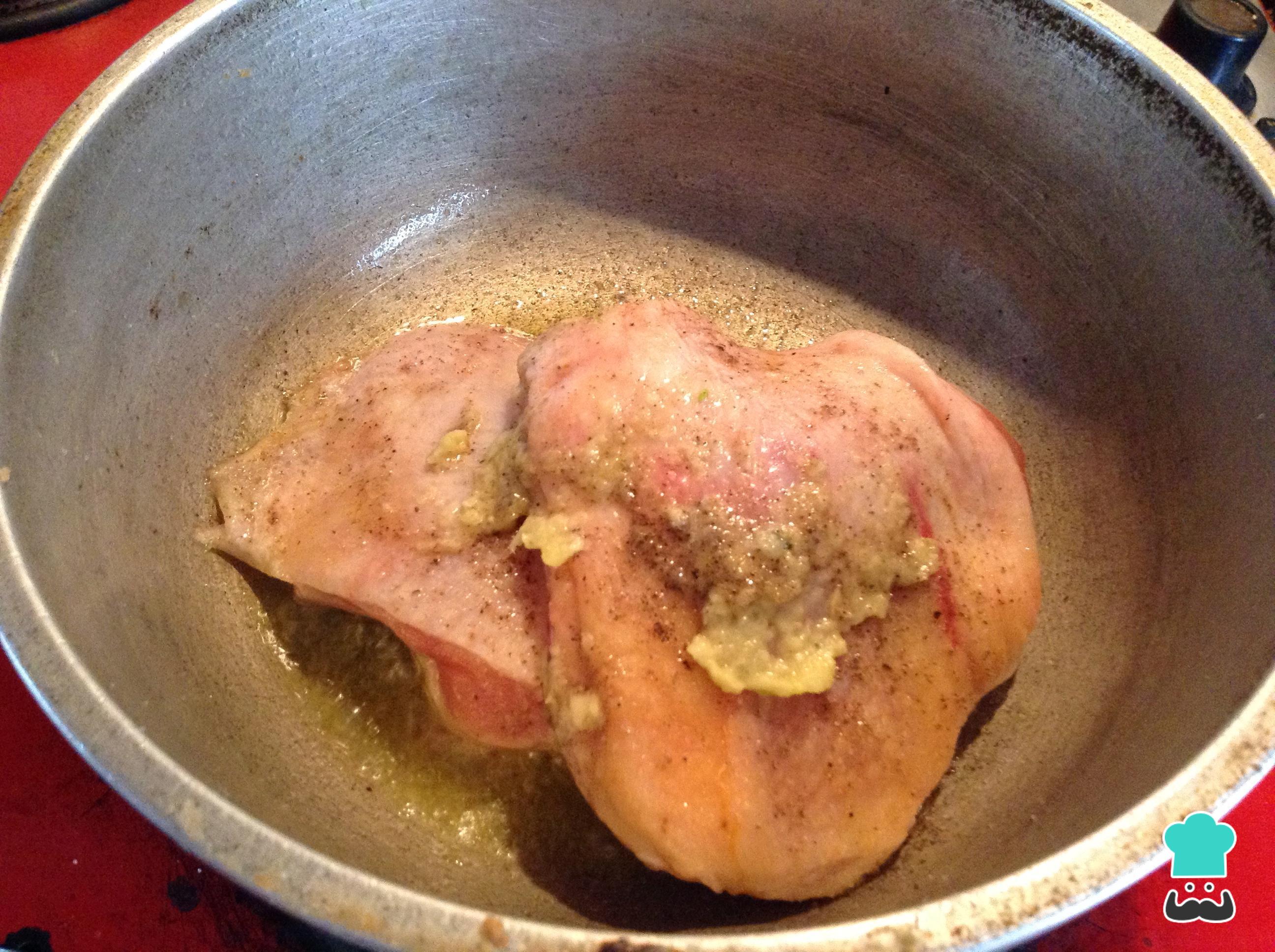 Continue preparando o macarrão com frango desfiado: tempere os peitos de frango com sal, pimenta e um pouco a pasta de alho. Doure numa panela com um pouco de azeite, cubra com água e cozinhe por 20 minutos.
