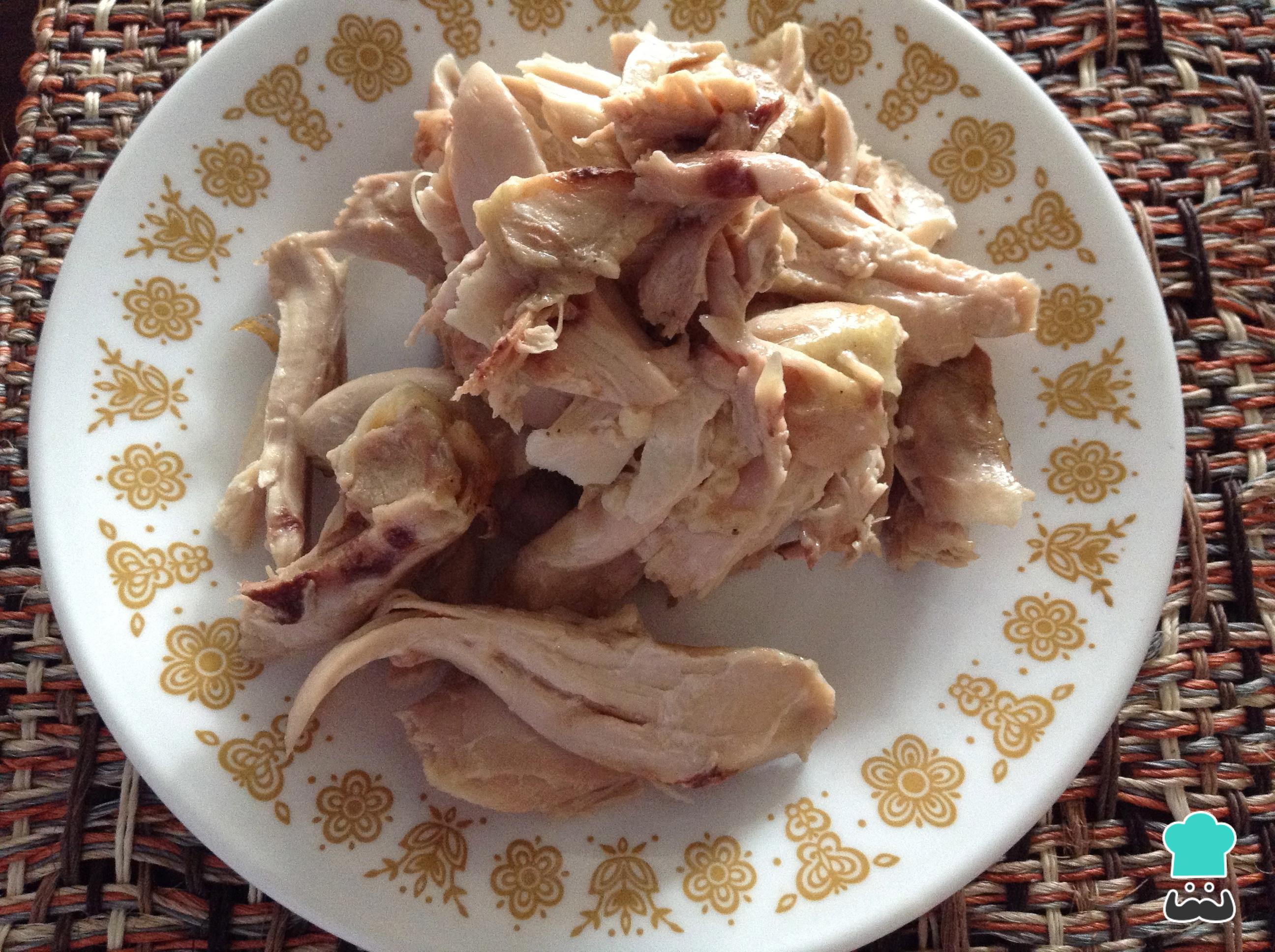 Após o passo anterior, desfie o frango e rejeite as peles e os ossos.