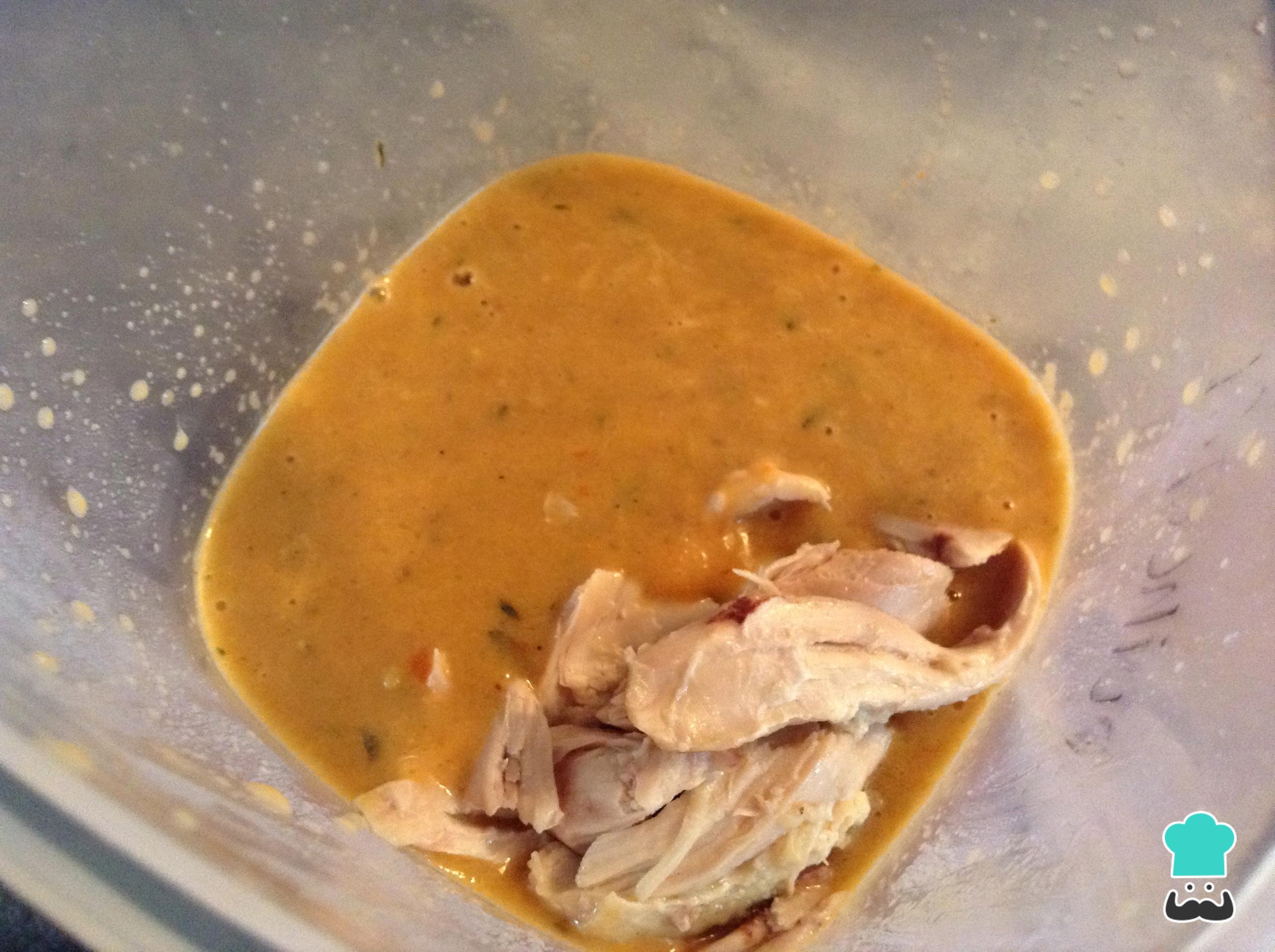 O próximo passo deste macarrão com frango desfiado é bater no liquidificador ou com o mixer os ingredientes do molho com o creme de leite, até obter uma mistura homogênea e cremosa. Acrescente também o frango e misture.