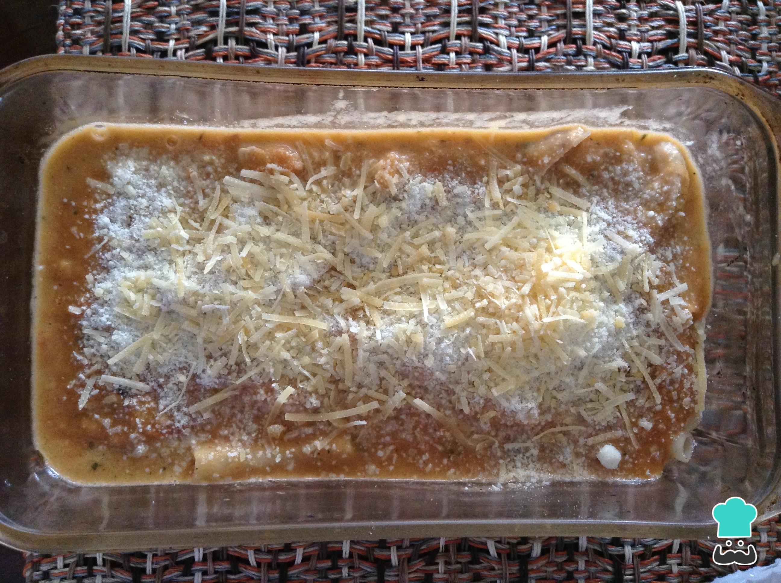 Verta o molho anterior sobre o macarrão que está no refratário. Polvilhe queijo parmesão e leve a assar no forno preaquecido a 150ºC durante 10-15 minutos, ou até o queijo gratinar.