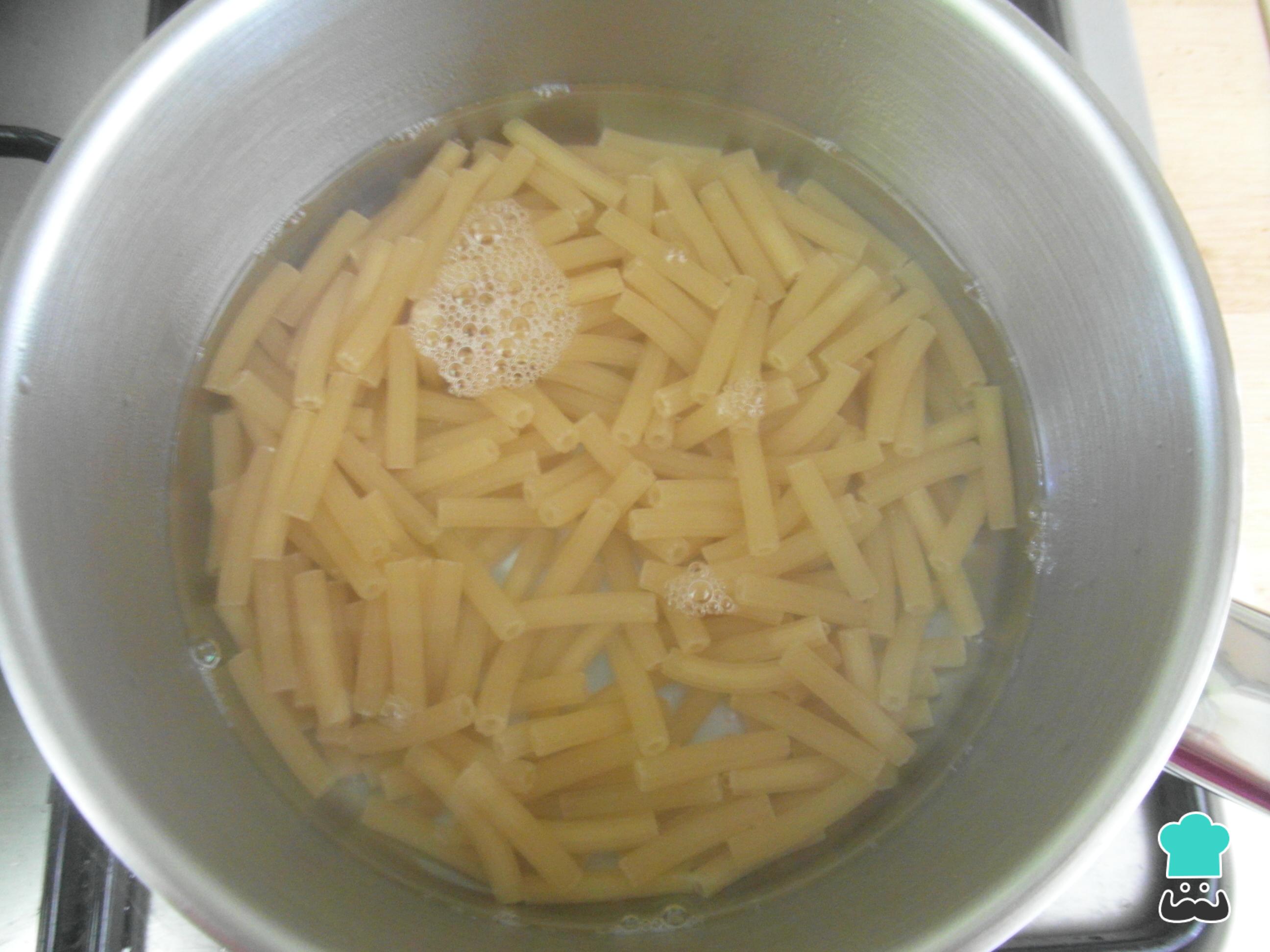 Cozinhe o macarrão em uma panela com água fervente e um pouco de sal, até que fique al dente. No final escorra a água e misture o macarrão com um pouco de azeite, para que não grude. Reserve.