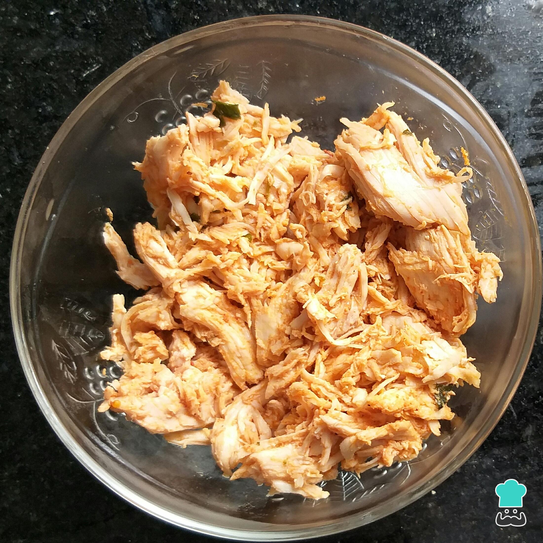 Desfie o peito de frango e reserve. Para esta receita você pode cozer peito de frango ou aproveitar as sobras de peito de frango cozido ou assado.