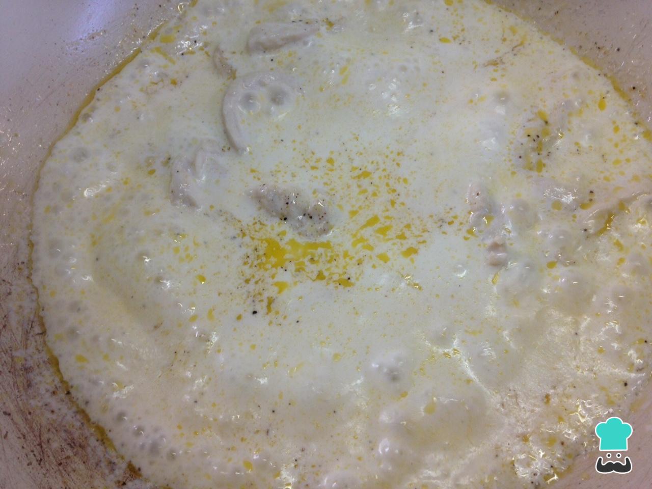 Quando o frango dourar, adicione o creme de leite e deixe cozinhar em fogo médio entre cinco e 10 minutos, dependendo da espessura desejada para o molho. Tempere com sal e pimenta do reino.