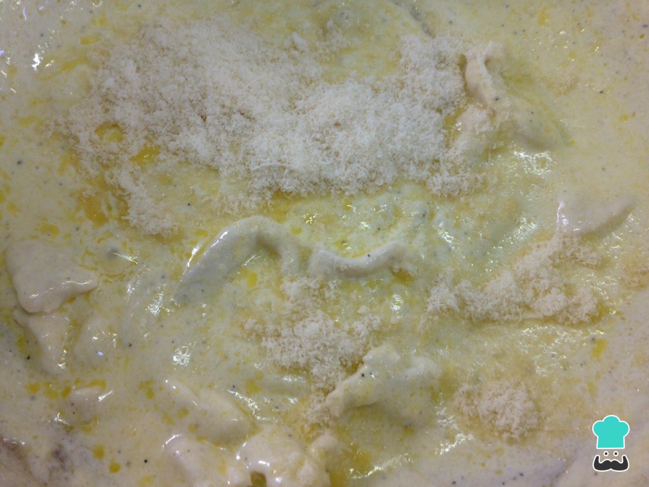 Quando o creme de leite tiver evaporado ligeiramente e o molho ganhar a consistência de um creme, adicione o queijo parmesão. Mexa bem para formar um creme suave e uniforme.