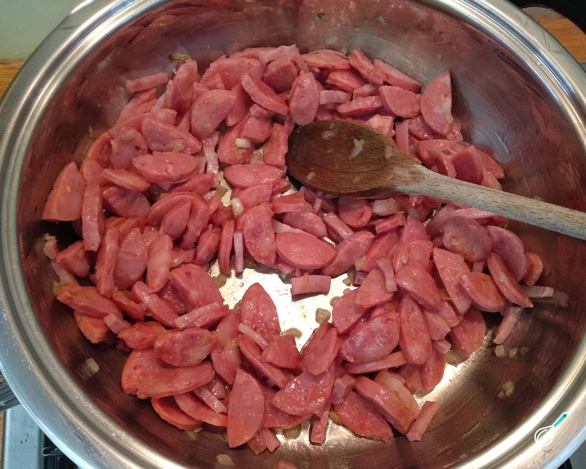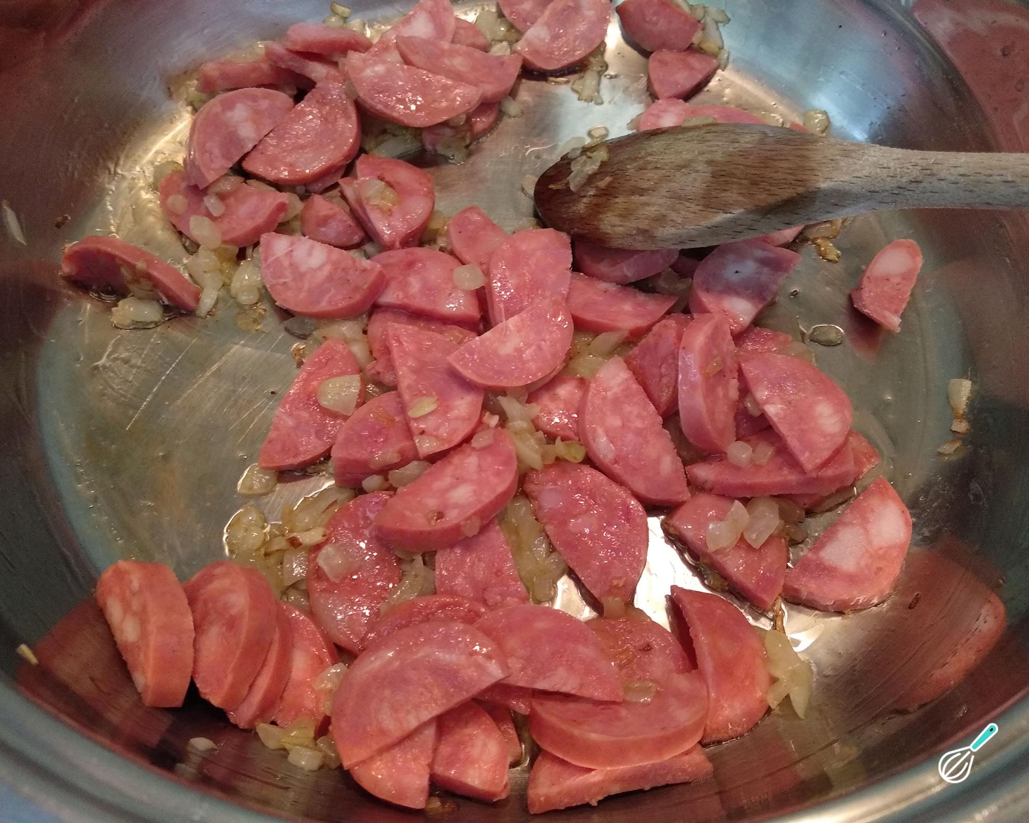 Dica: Não adicionei sal porque a linguiça, o bacon e o molho de tomate já são salgados.