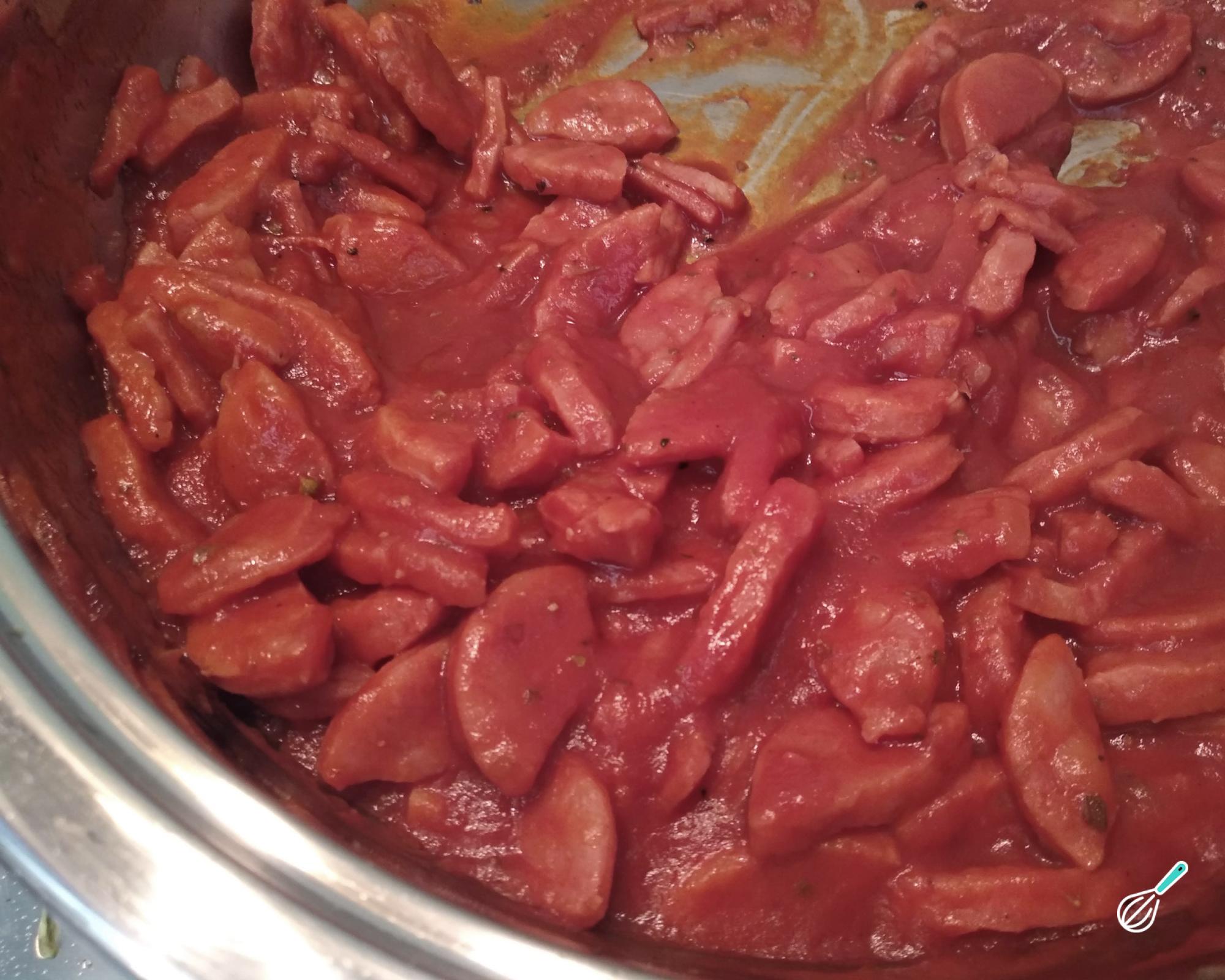 Por fim adicione o molho de tomate e os temperos: oréganos, pimenta do reino e molho de pimenta. Misture tudo e deixe cozinhar por mais 5 minutos, para apurar os sabores.