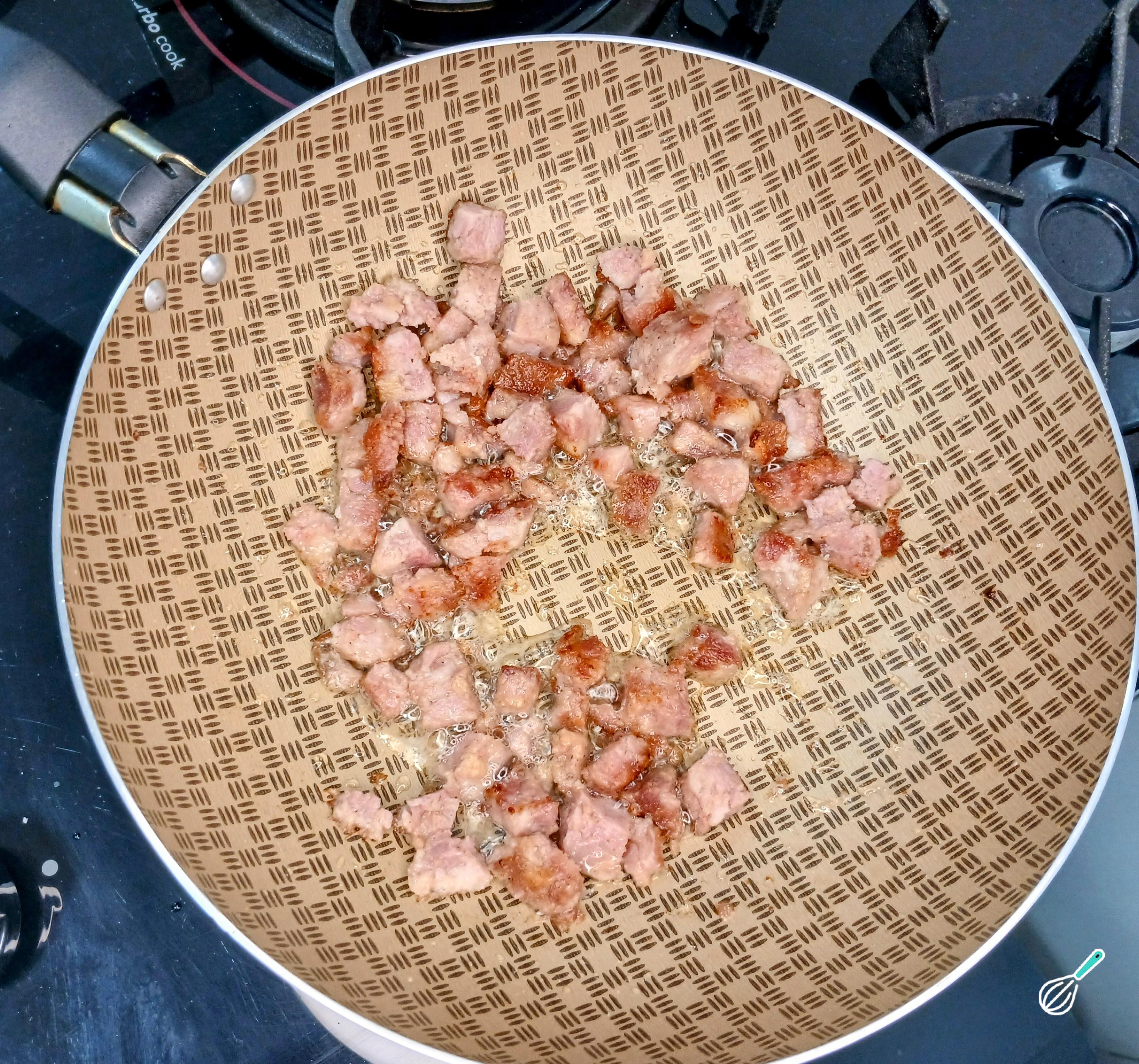 Dica: A linguiça cortada em cubos pequenos frita mais rápido e por inteiro.