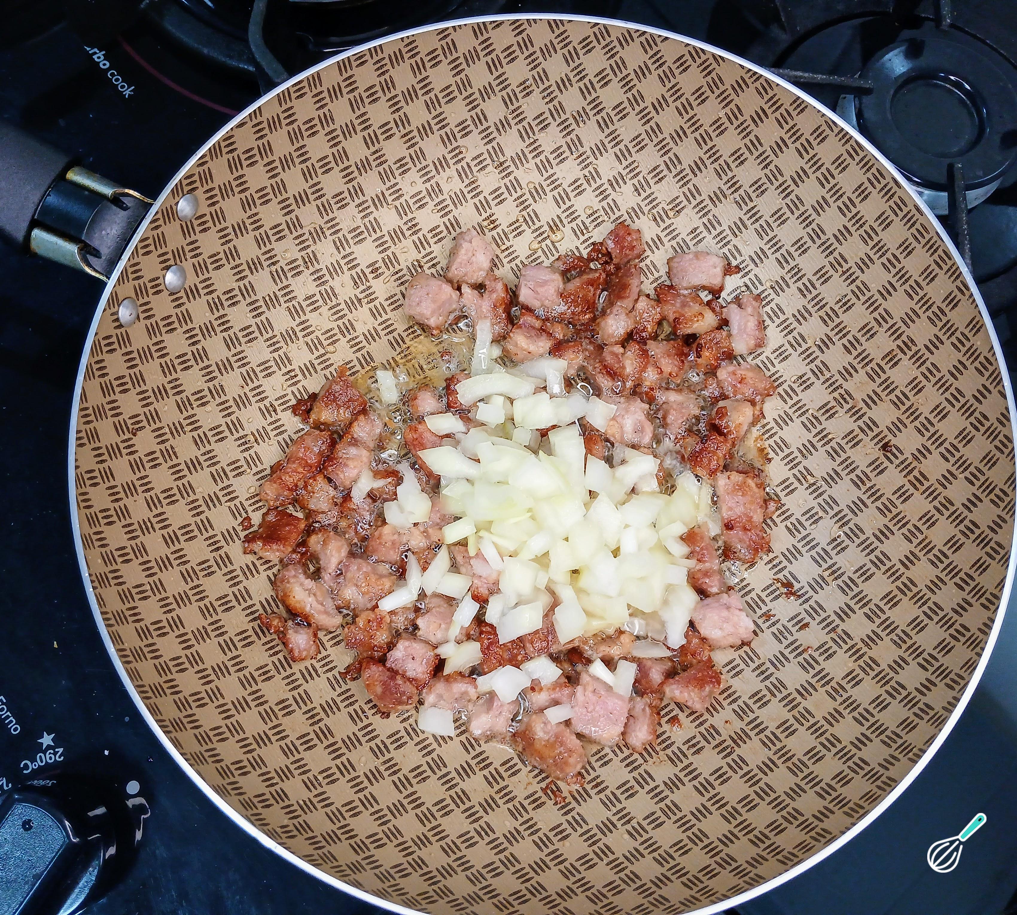 Depois de fritar a linguiça, adicione a cebola branca picada e deixe refogar um pouco. Mexa sempre para fritar por igual.