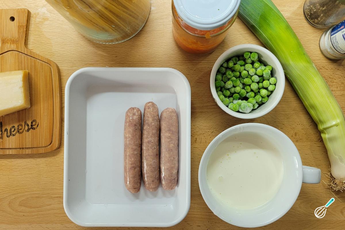 Separe os ingredientes para fazer seu macarrão de linguiça toscana com creme de leite. Aqui usei alho poró porque combina muito com molhos à base de creme de leite, mas você também pode usar cebola ou cebola roxa. Para o molho, misturei um pouquinho de molho de tomate caseiro para trazer um sabor a mais, mas você pode usar apenas o creme de leite. Se quiser, incremente com mais de pimenta do reino e um pouco de noz moscada.