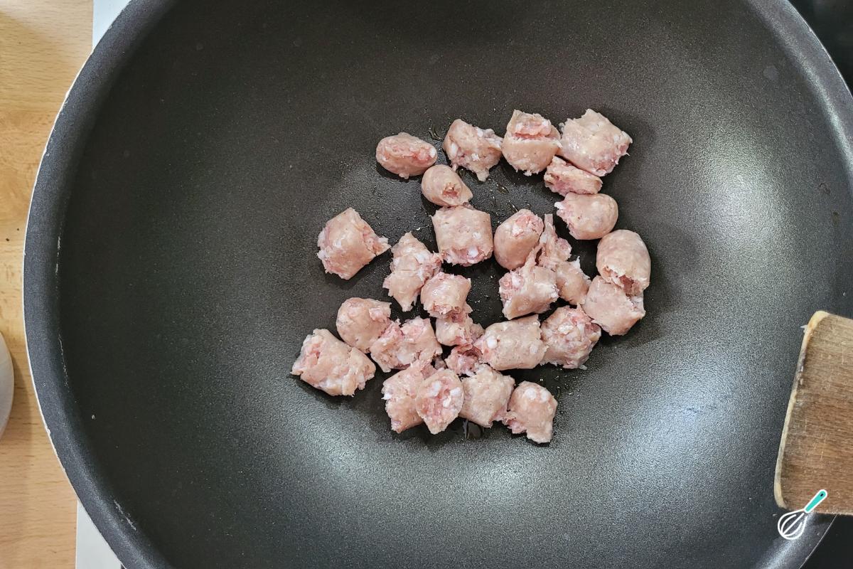 Enquanto isso, tire a pele de das linguiças, quebre em pedaços menores e leve para uma frigideira para dourar. Não é necessário adicionar óleo, porque as linguiças vão soltando a própria gordura.