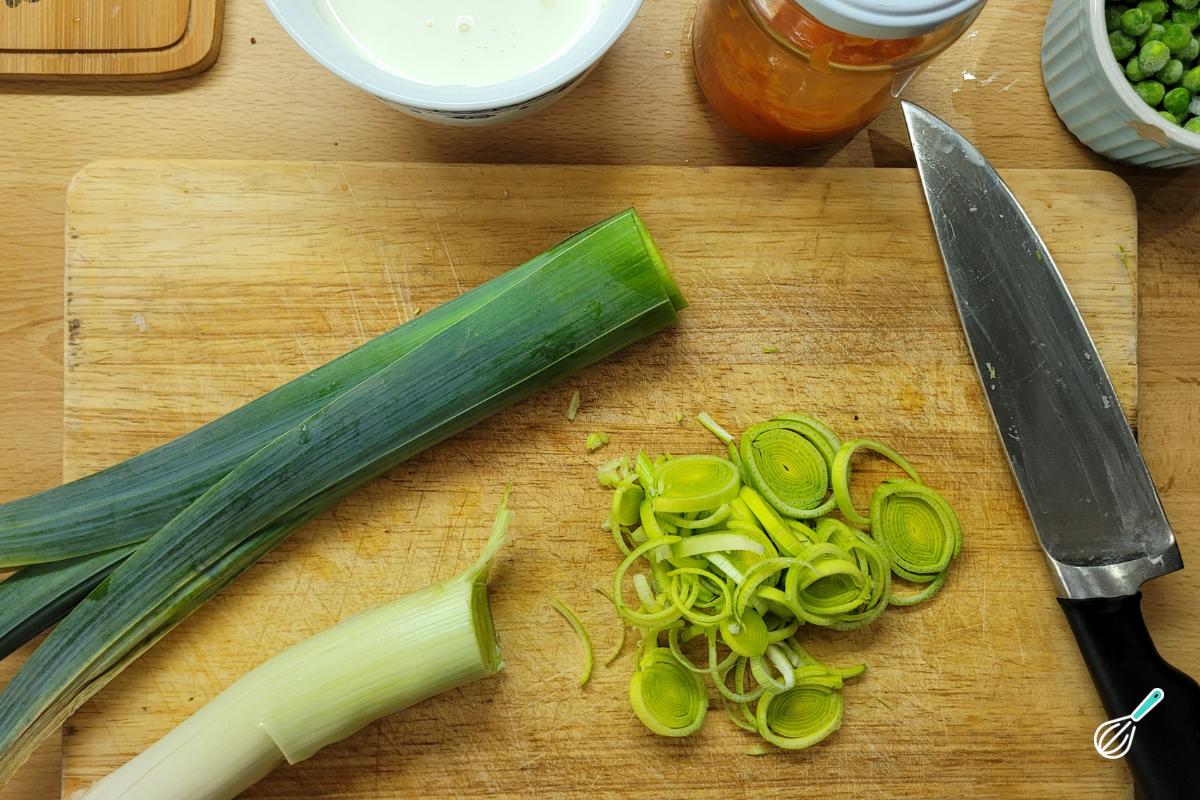 Enquanto as linguiças douram, aproveite para cortar o alho poró em fatias finas.