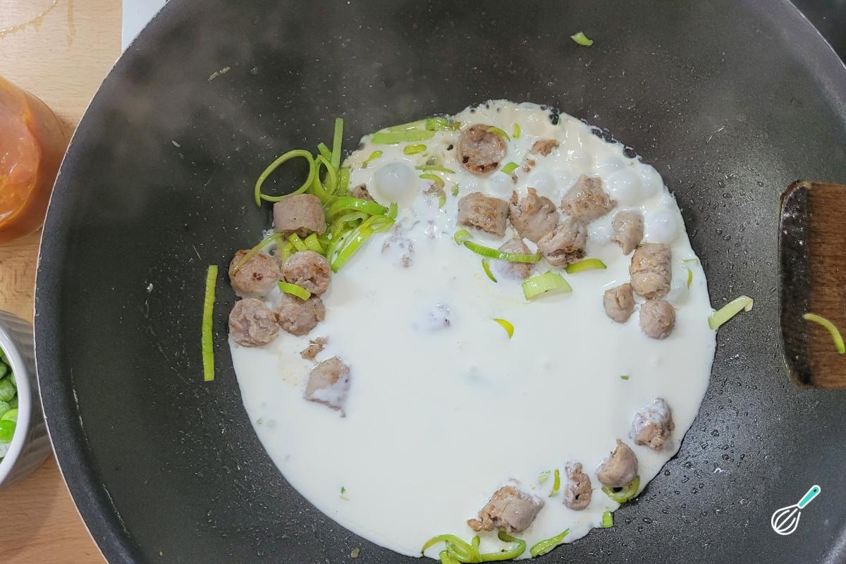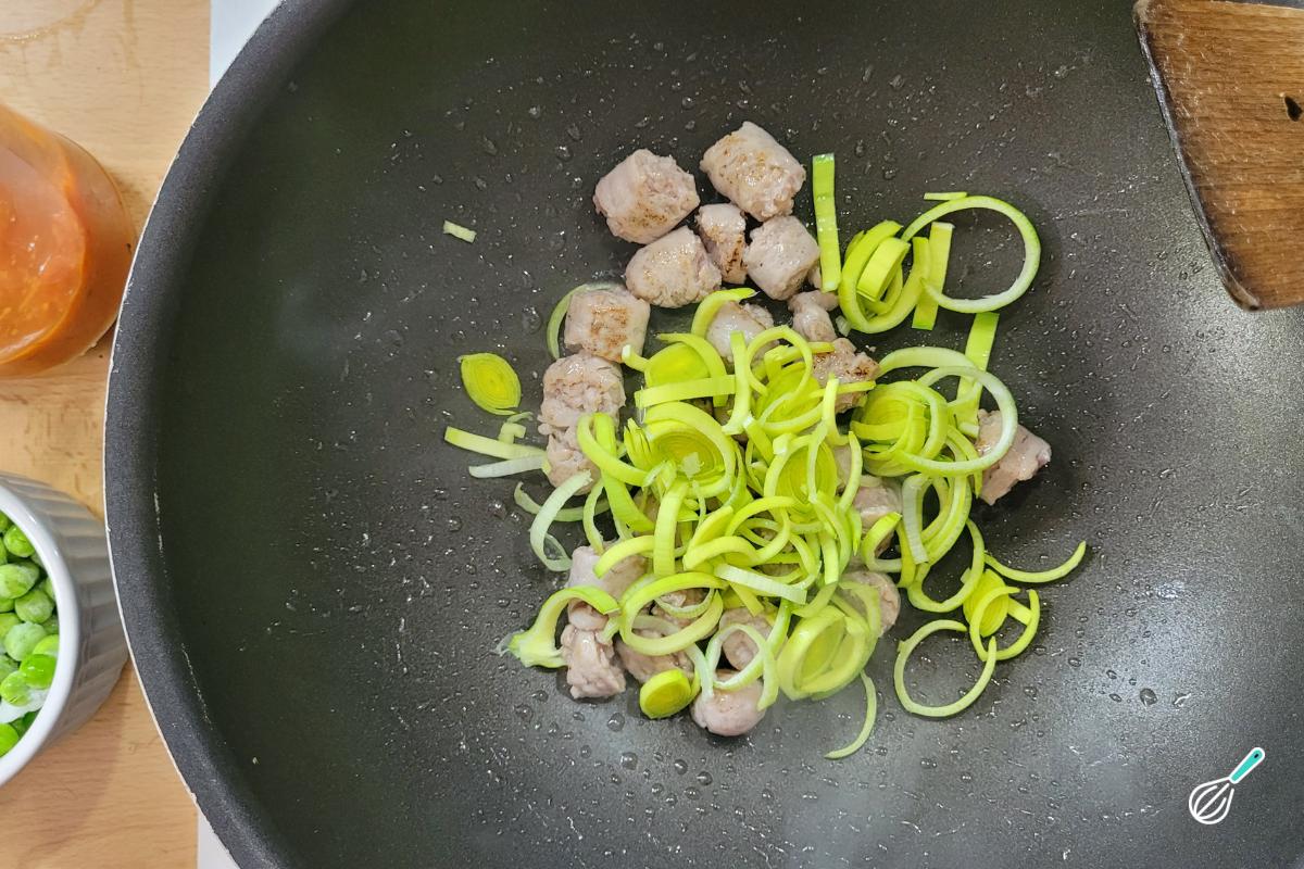 Quando as linguiças estiverem douradinhas, adicione o alho poró. Se precisar, coloque um fiozinho de azeite para ajudar a dourar.