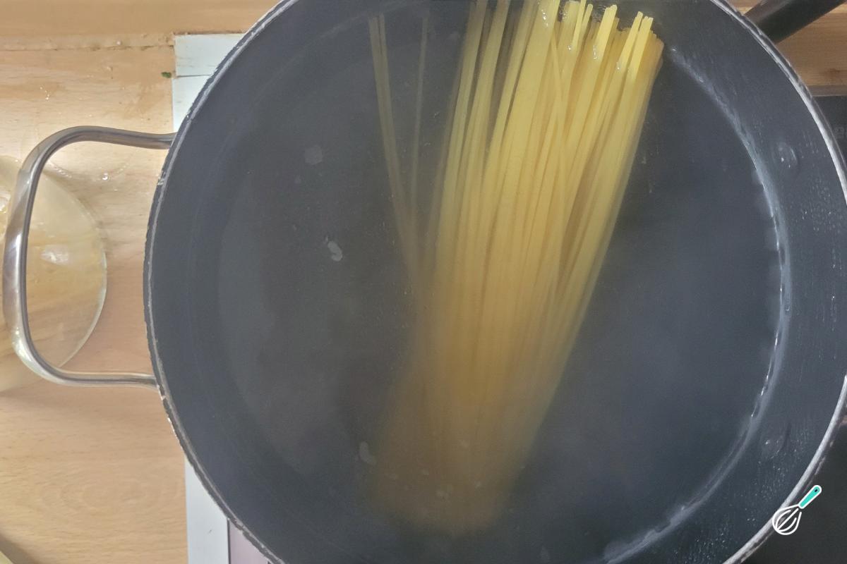 Antes de começar, leve uma panela grande com água para ferver para cozinhar o macarrão. Para cozinhar o macarrão, a água deve estar fervendo vigorosamente e ter uma quantidade generosa água. Isso tudo garante que a massa não grude, fique no ponto certo e com mais sabor.
