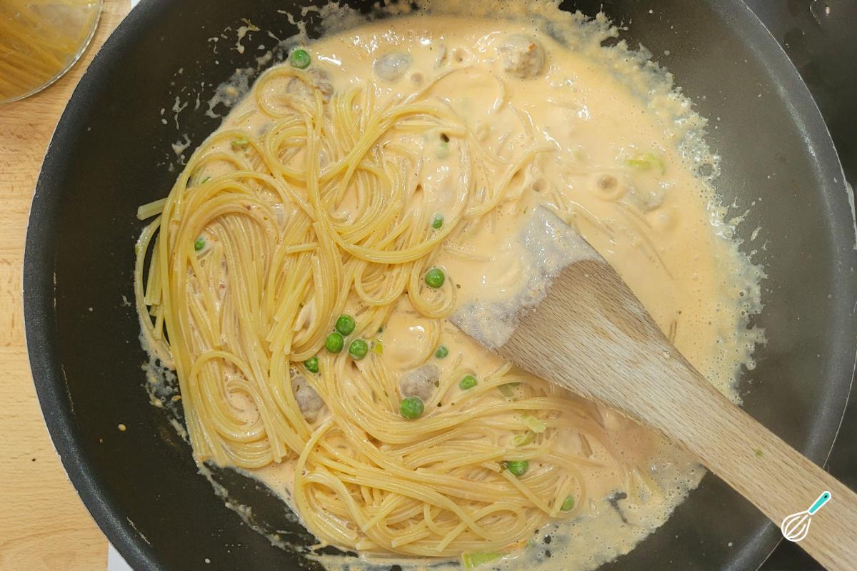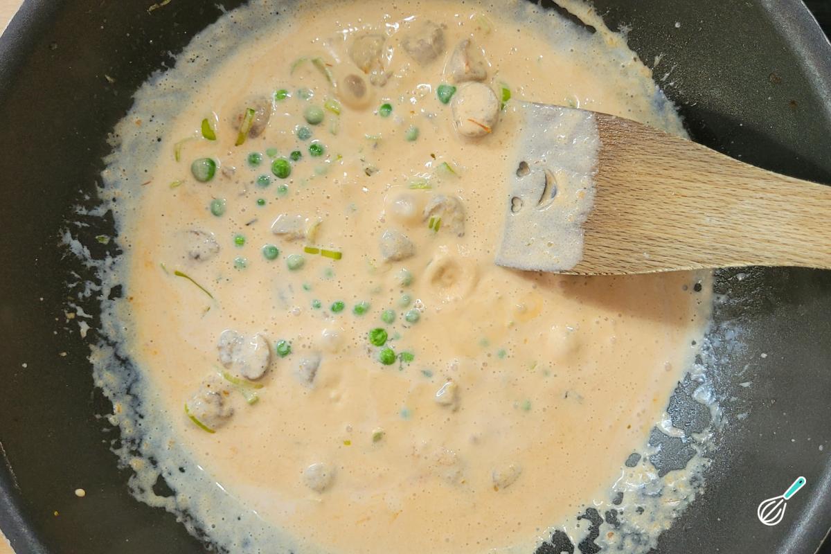 Adicione as ervilhas congeladas e deixe até que cozinhem e o molho tenha dado uma leve encorpada.