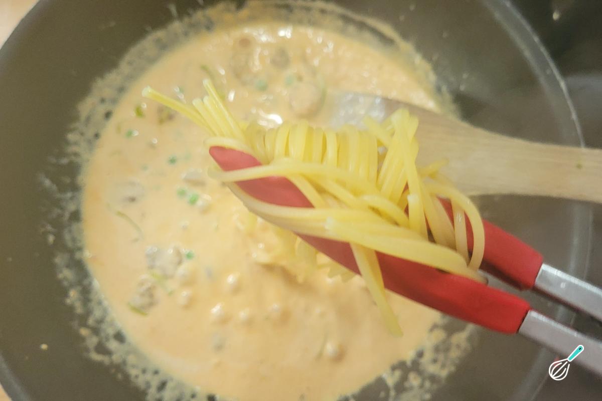 Quando o macarrão estiver cozido al dente, adicione ao molho. Não é necessário escorrer, você pode pegar com uma pinça. Se um pouco da água do macarrão for junto, não tem problema, porque a água tem o amido do macarrão e ajuda a dar o ponto do molho.
