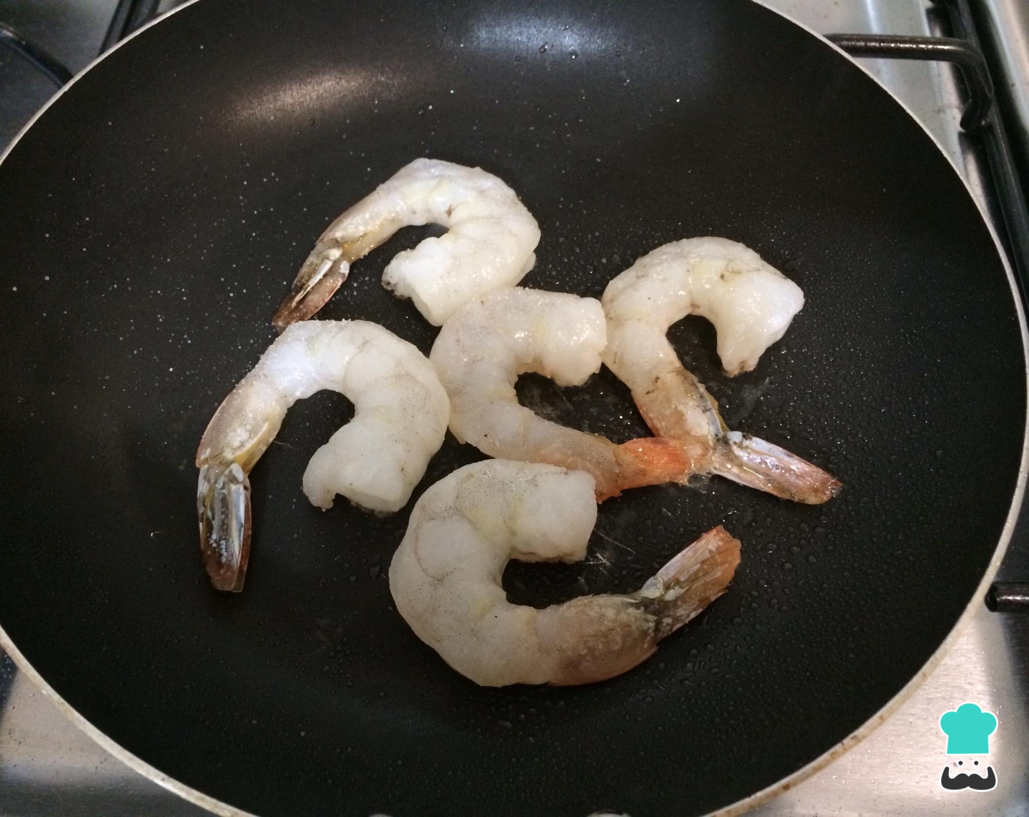 Em uma frigideira com um pouco de óleo, cozinhe os camarões dos dois lados, previamente temperados, por 5 minutos.